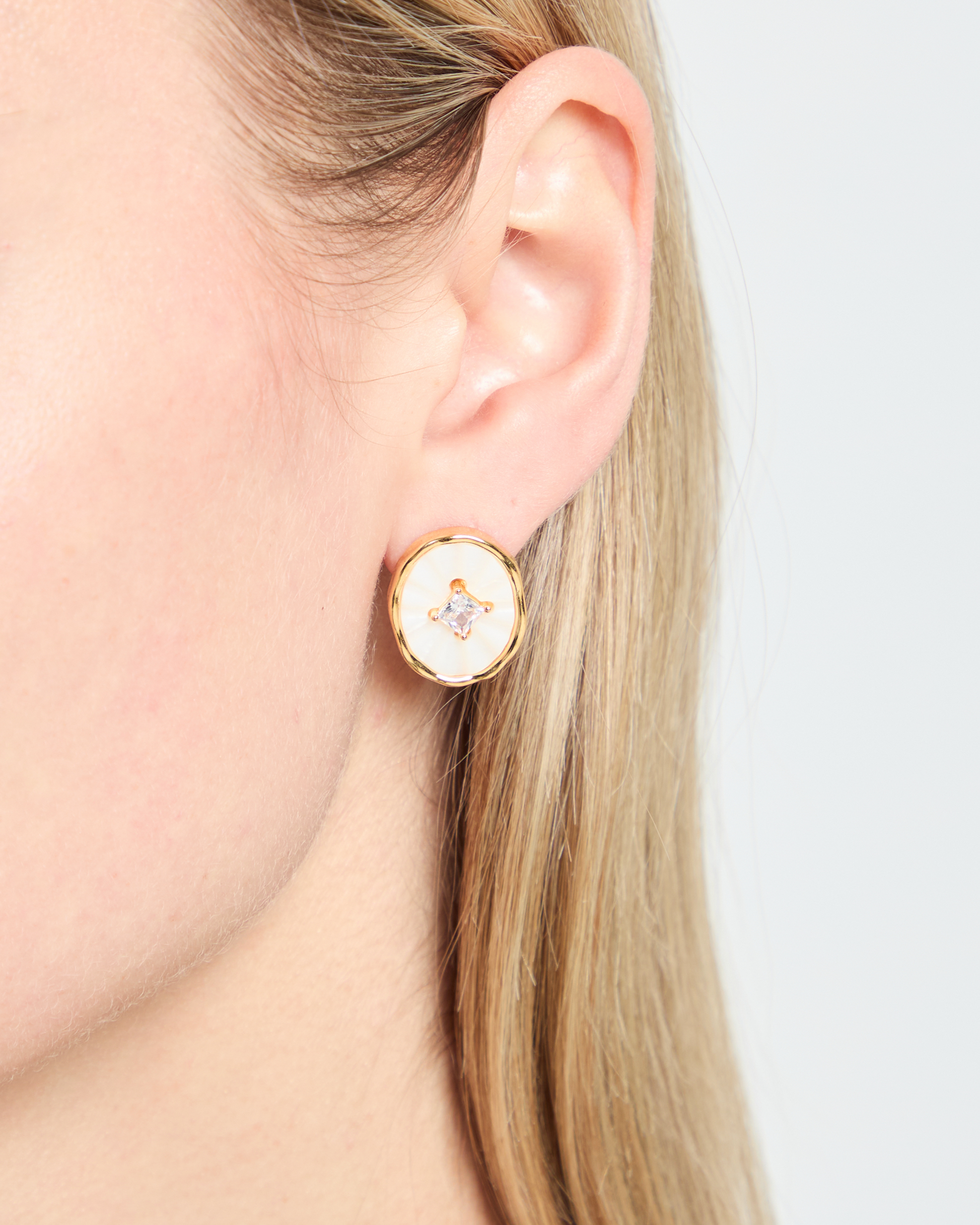 Elevate your style with our Mother of Pearl Crystal Stud Earrings. Featuring a luminous mother of pearl with a central crystal star, these earrings exude soft elegance. The stud closure ensures a secure and comfortable fit.