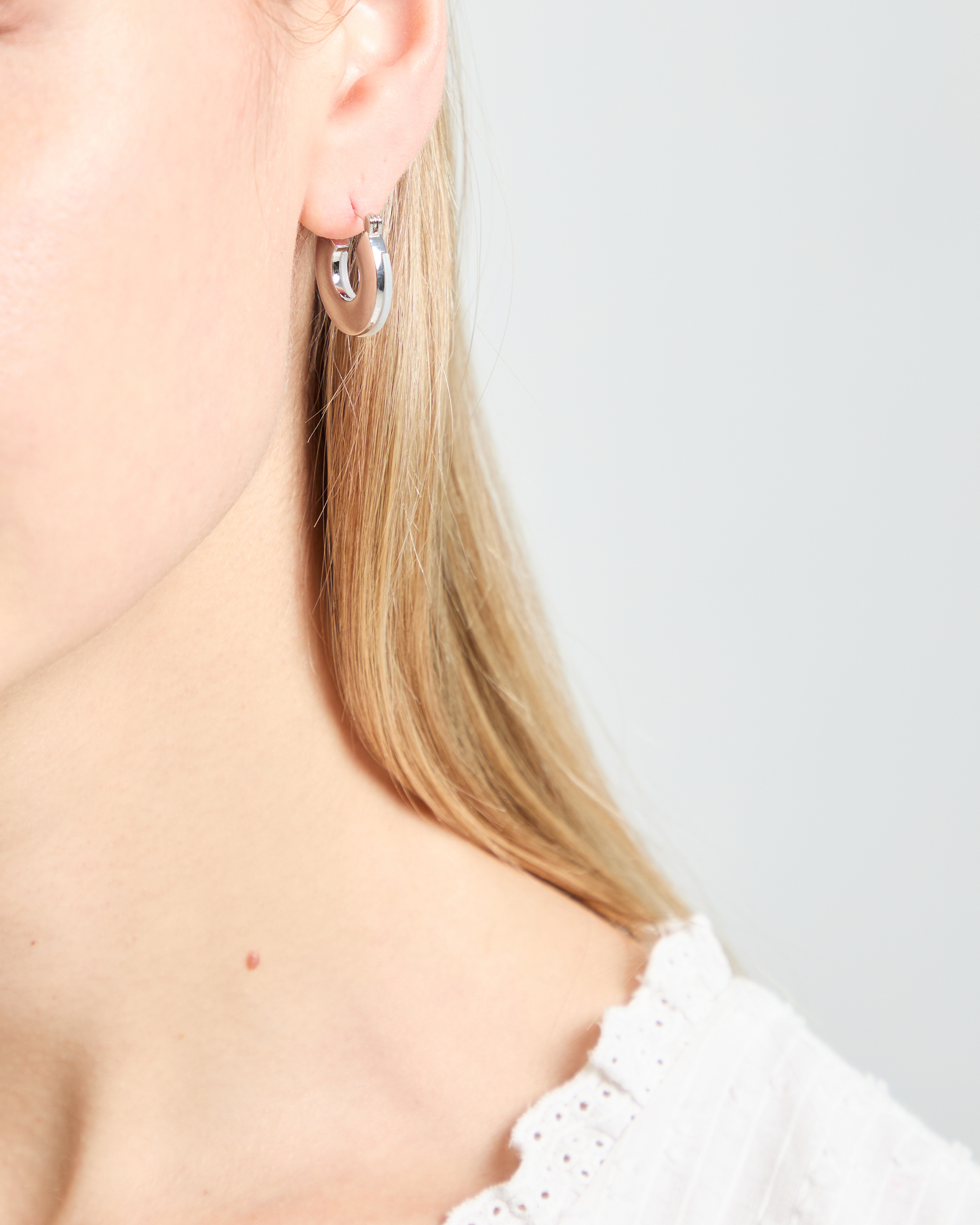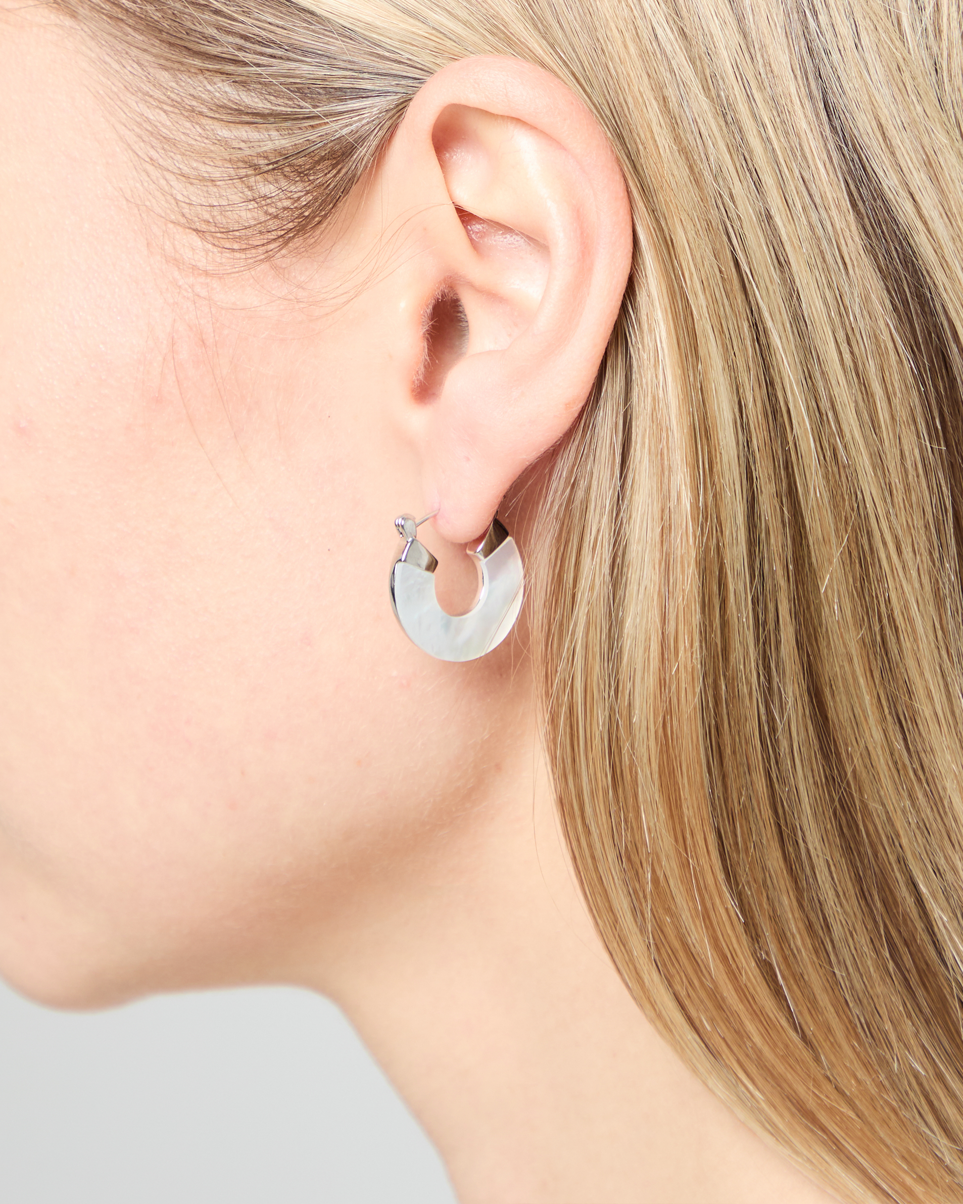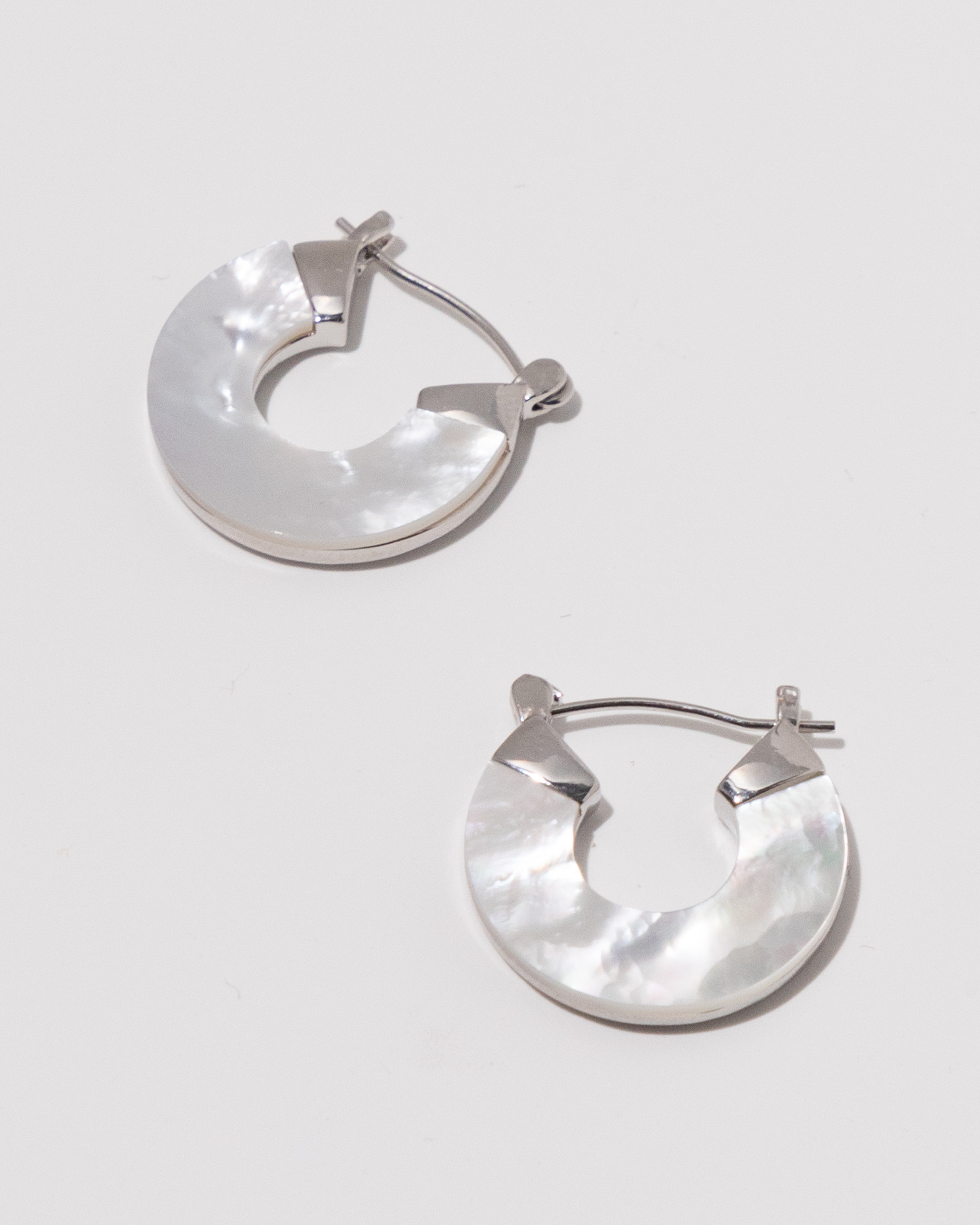 Expertly crafted with a sculptural and modern design, these Mother of Pearl Hoop Earrings feature luminous silver and natural mother of pearl. Elevate any outfit with their elegant and timeless appeal.