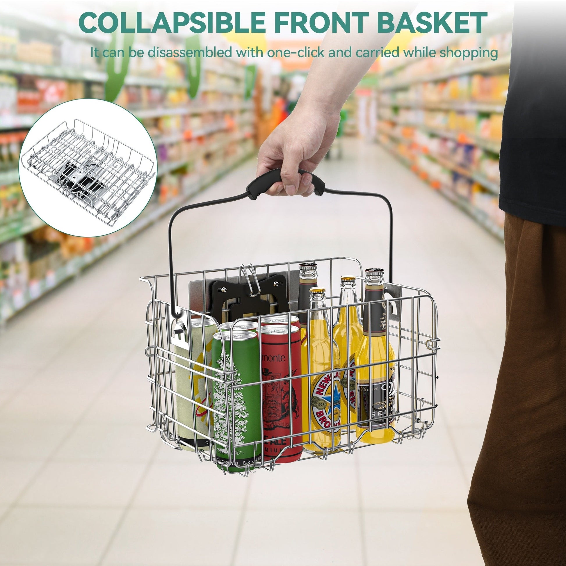 • The front basket is foldable and detachable, and you can carry it for shopping with one button disassembly