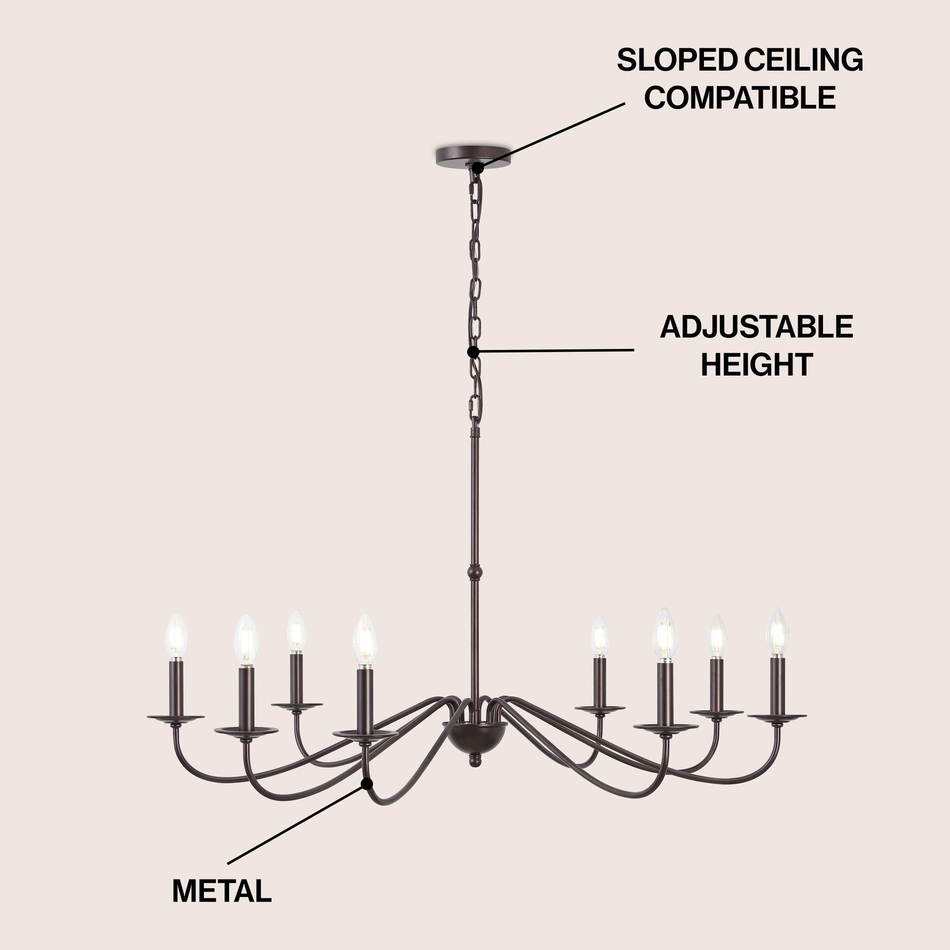 • Adjustable-height chandelier works best for ceilings up to twelve feet high