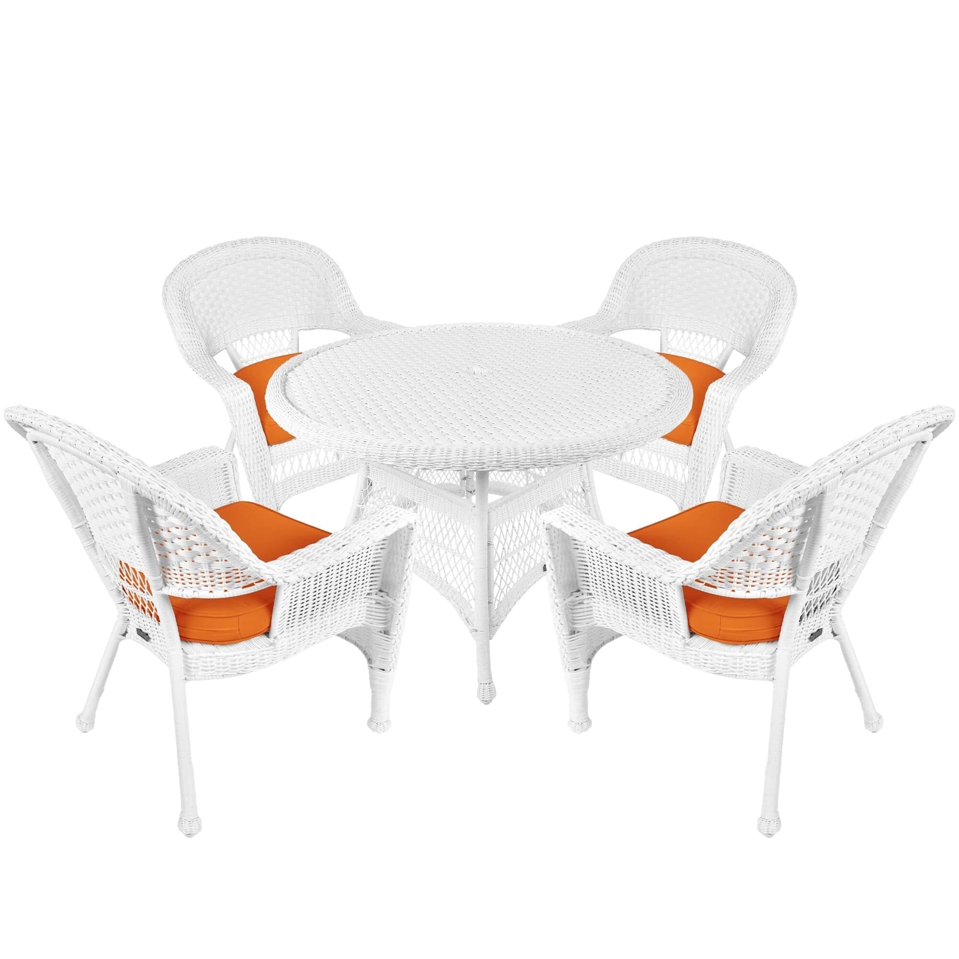 Make your outdoor space more comfortable with this 5-piece White Resin Wicker Dining Set. Enjoy the comfort of indoor living with this stylish wicker set, which comes with a round wicker table and four chairs with plush cushions available in various colors. The set is built to last with its steel frame and all-weather resin wicker.