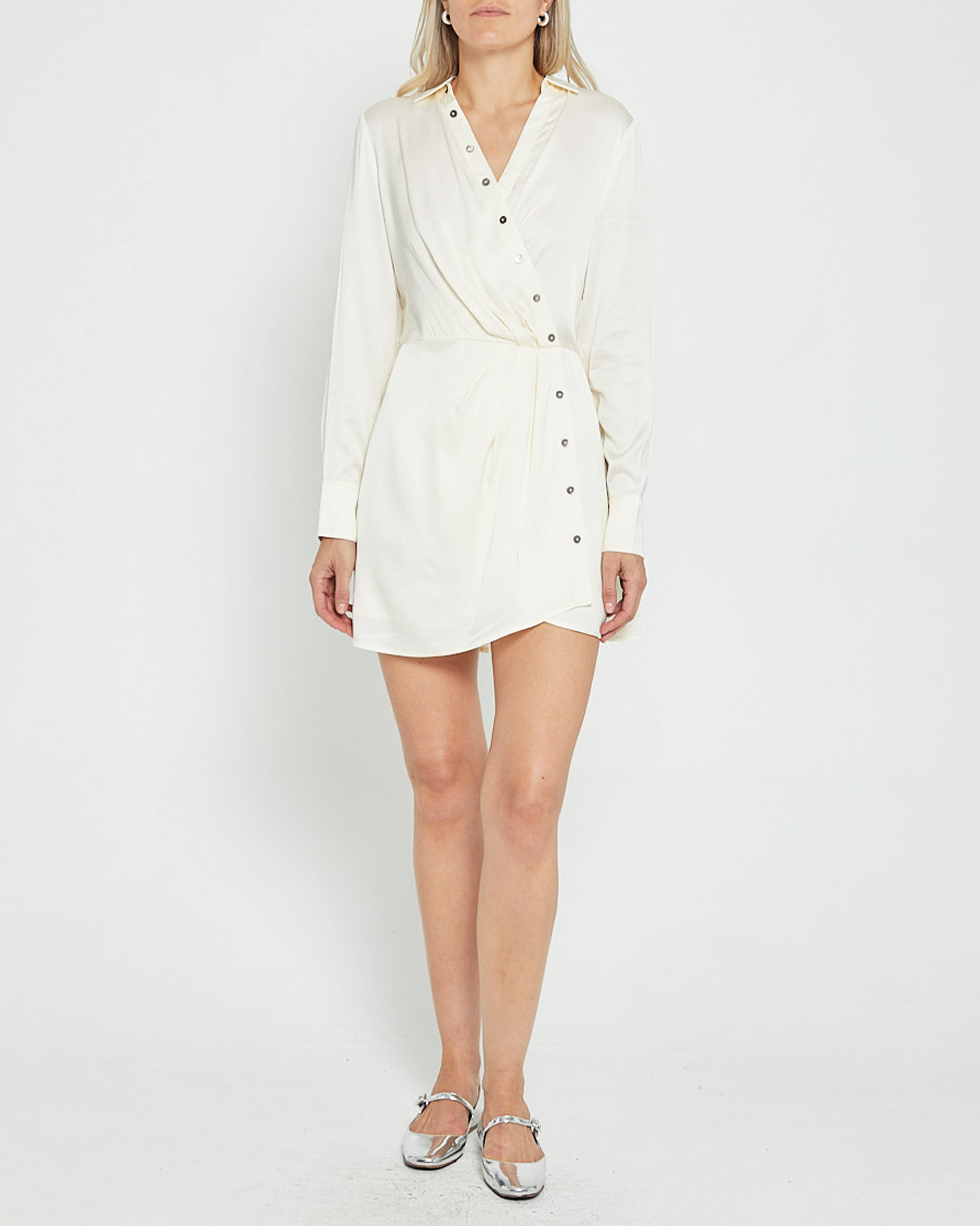 Crafted from a silky fabric, the Adya Dress is a beautiful and sophisticated piece. Its wrap silhouette flatters the body and features a collar detail while buttons add a touch of classic charm. The drapey design adds a laid-back, elegant finish.
