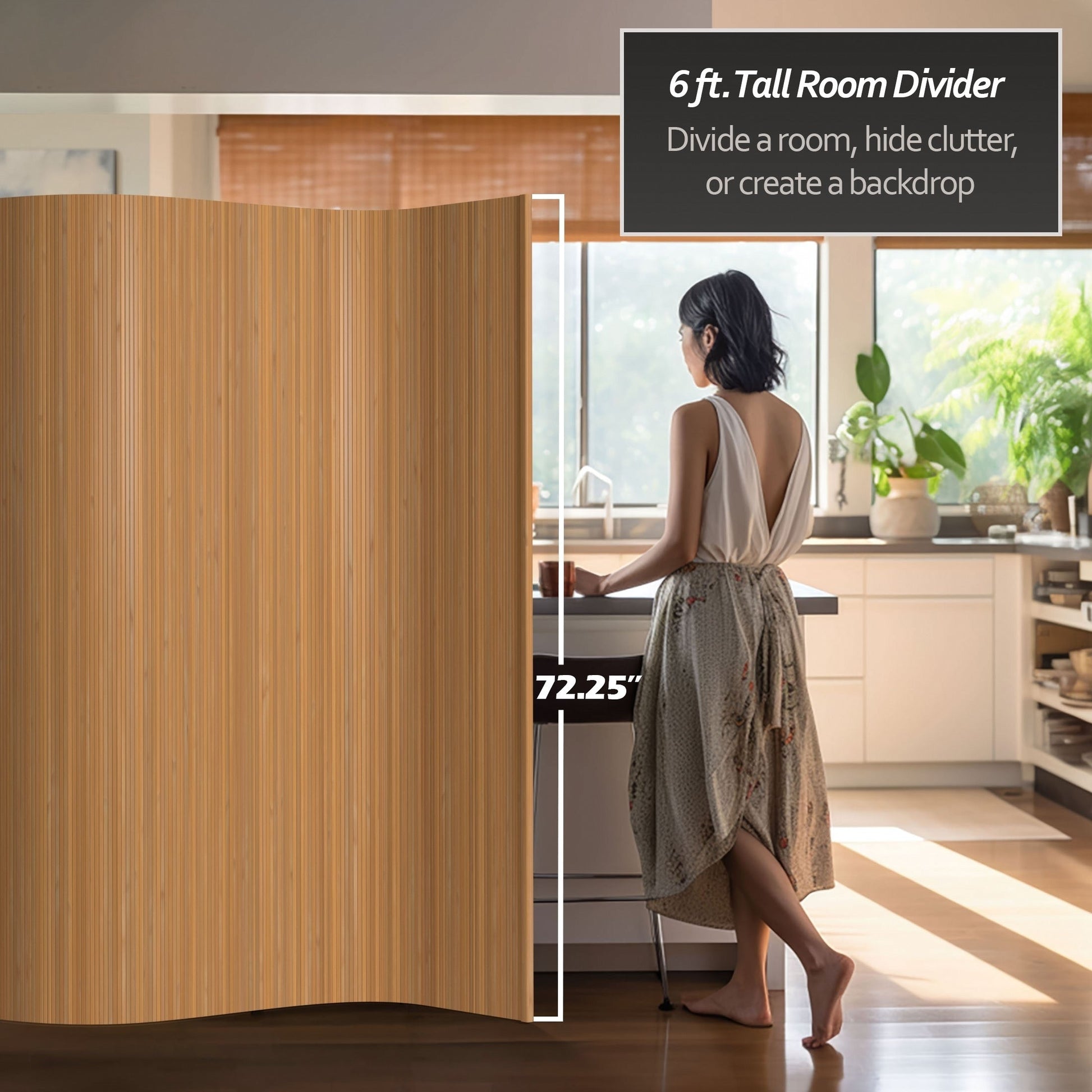 This full-sized room divider partition or space separator combines vintage midcentury modern design with contemporary aesthetics and convenience for an elegant way to divide a space or hide visual vlutter. Crafted from kiln dried lacquered bamboo slats in an interlocking wave design, easy to bend for multiple purposes, then rolls right up for easy storage when not in use. The tropical, bamboo decor adds a natural, earthy element to both home or professional work spaces. Offered in your choice of natural or stained finishes. Ready to use out of the box, no assembly required, clean with damp cloth.