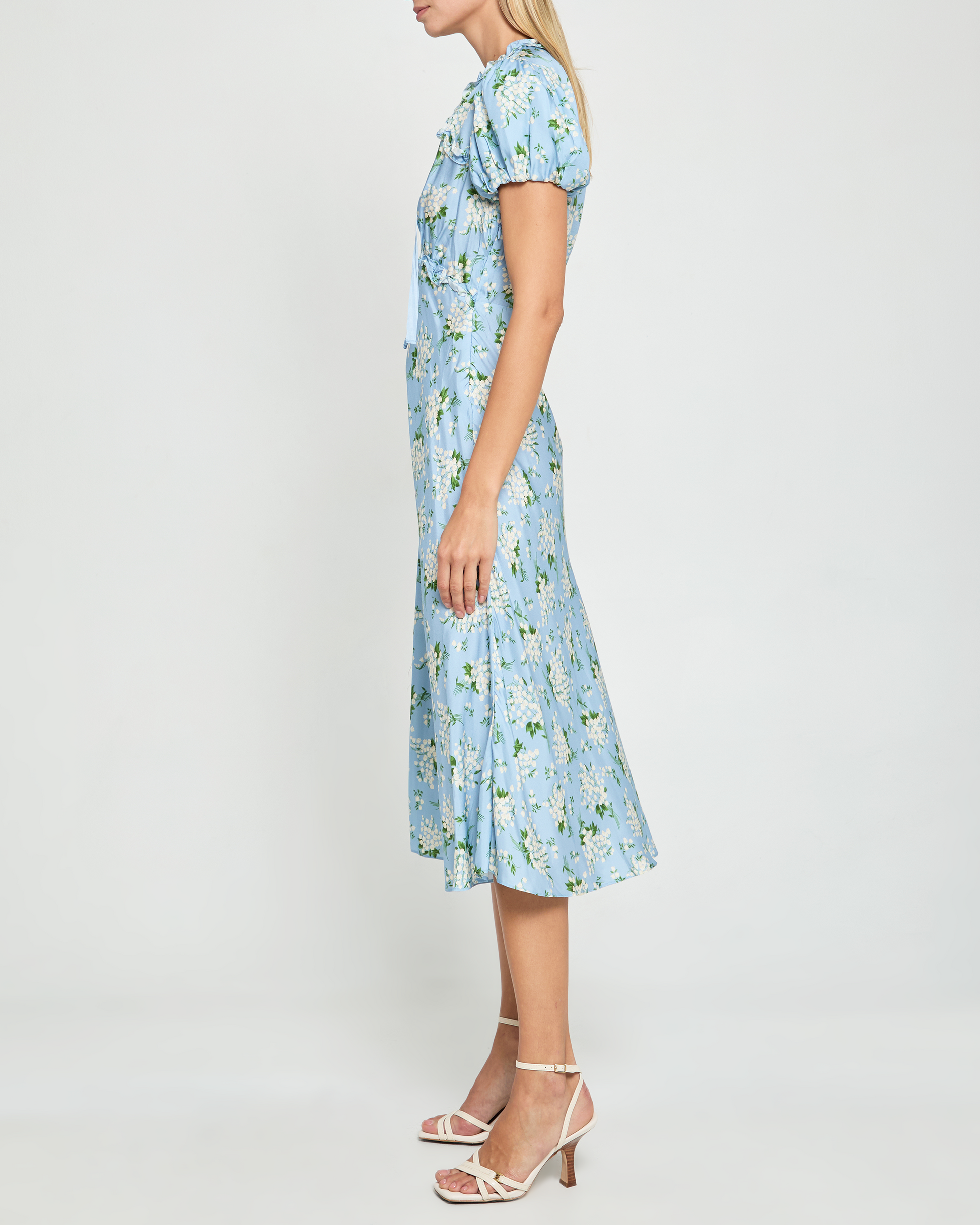 The Leona Dress features charming puff sleeves and ruffle details, perfectly accentuating the gorgeous floral printed silk blend. With the added option of a neck tie, this dress is versatile and effortlessly stylish. Made with high-quality materials, it's soft and comfortable for all-day wear.