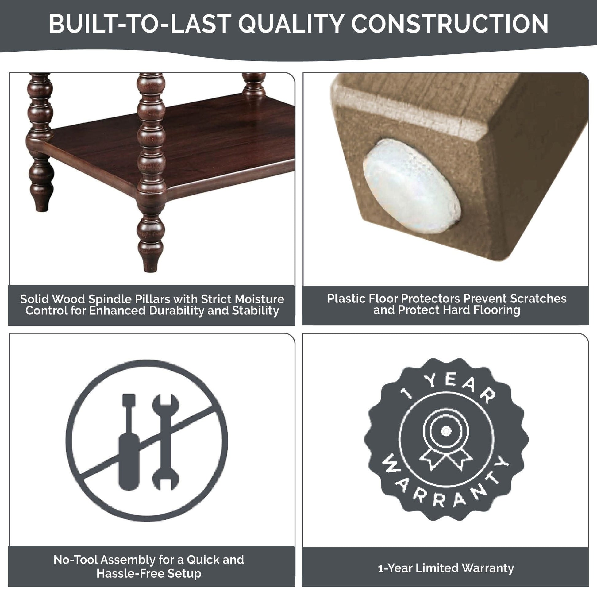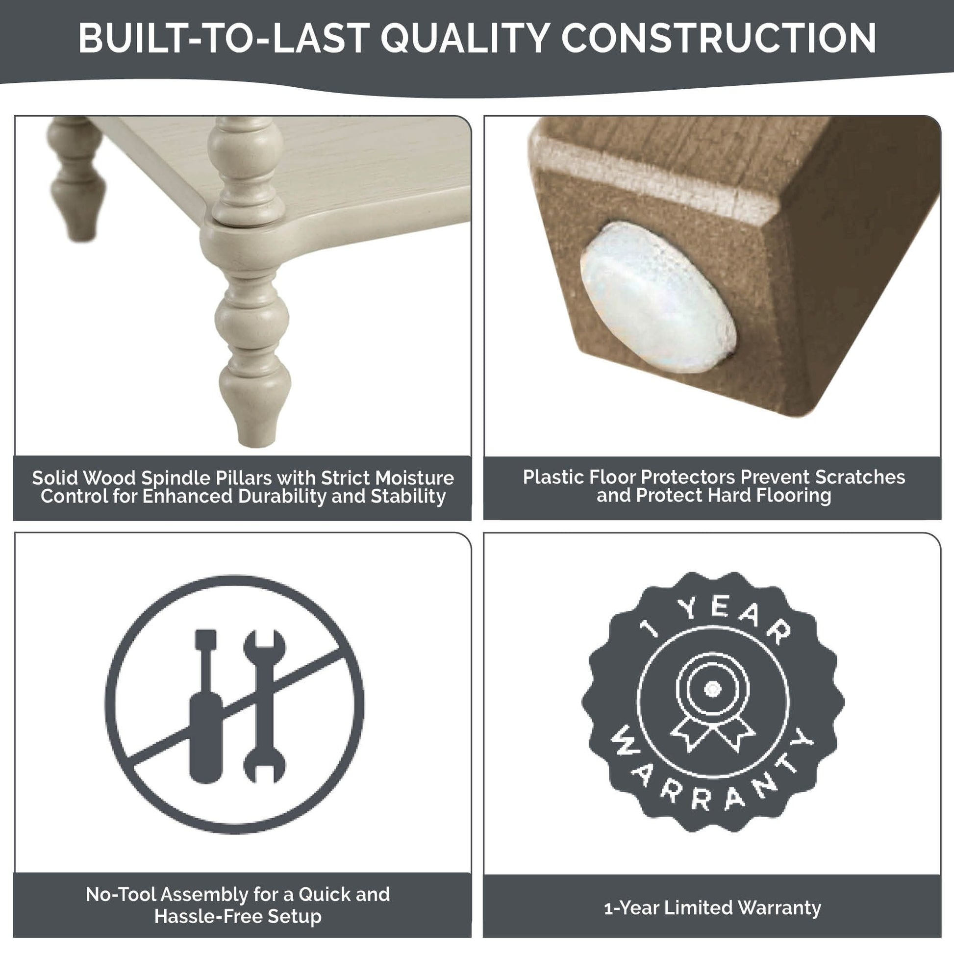 • Solid wood spindle pillars with strict moisture control for enhanced durability and stability