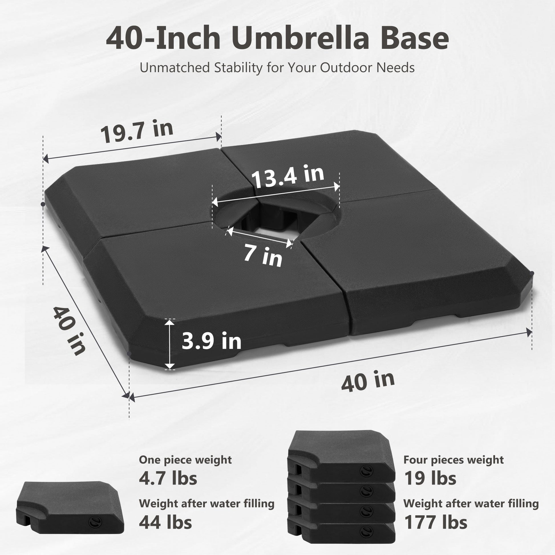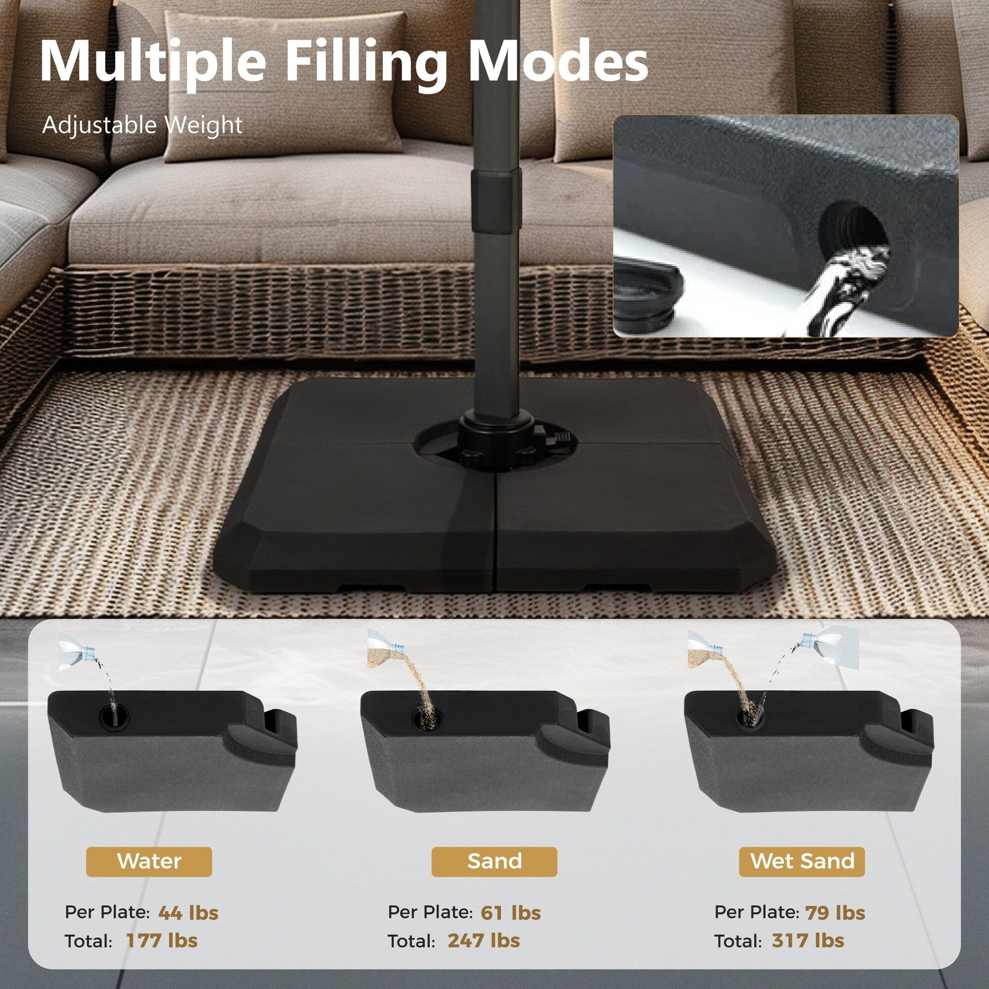 Note: For weights we recommend using a 4-piece base of at least 30kg each, for a total of 120kg. For your safety and to avoid unnecessary damage, please keep the umbrella closed and secured when it's under strong wind or not used.