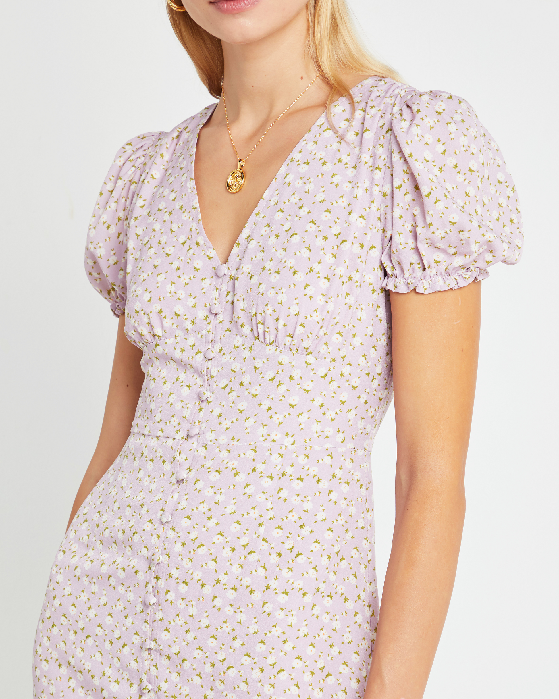 This charming style has a simple silhouette with sweet puff sleeves. Done in a rosy hue with button details.