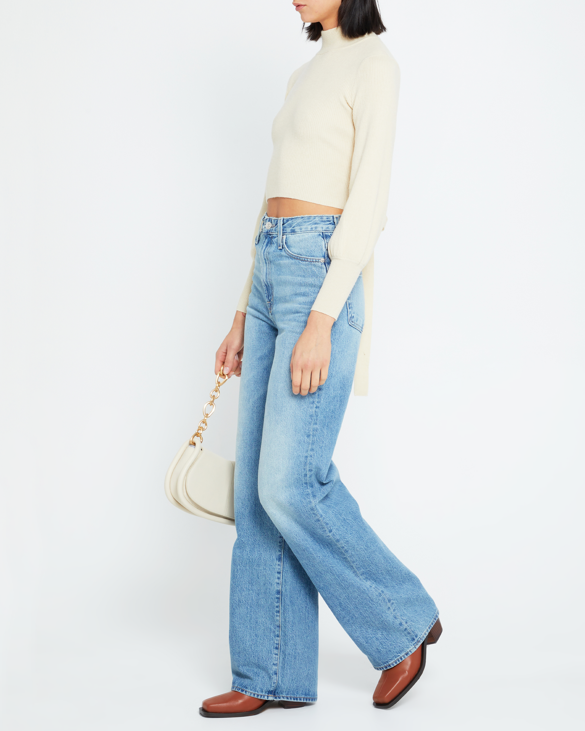 Bell sleeves and an open back detail create a feminine feel on this sweet, cream sweater. Done from a soft and stretchy knit material.