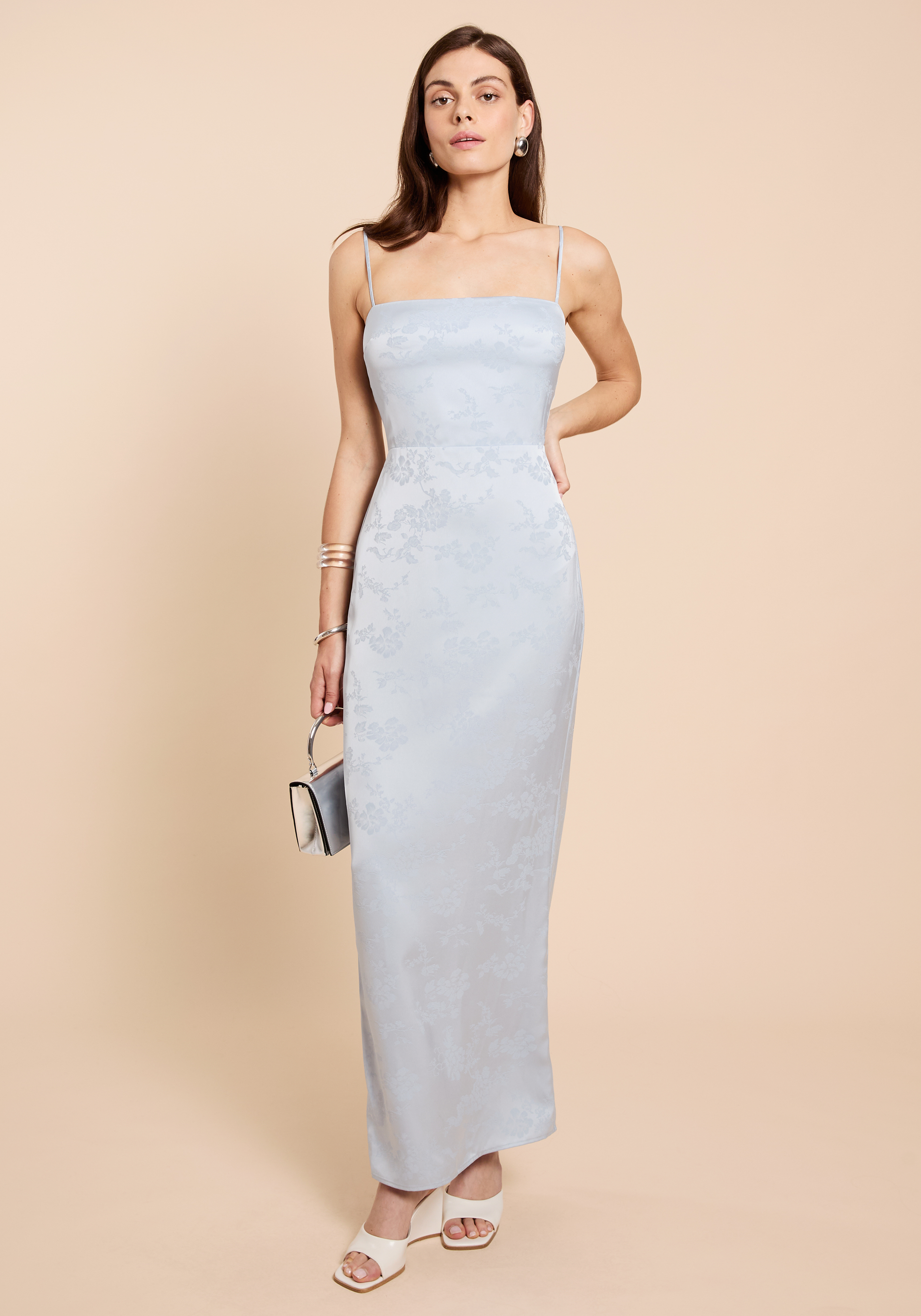The Calla Dress is crafted from floral jacquard fabric that features a subtle shine, highlighting its soft and sweet hue. Its simple column silhouette creates a sleek, chic look, perfect for those seeking understated elegance with a refined touch.