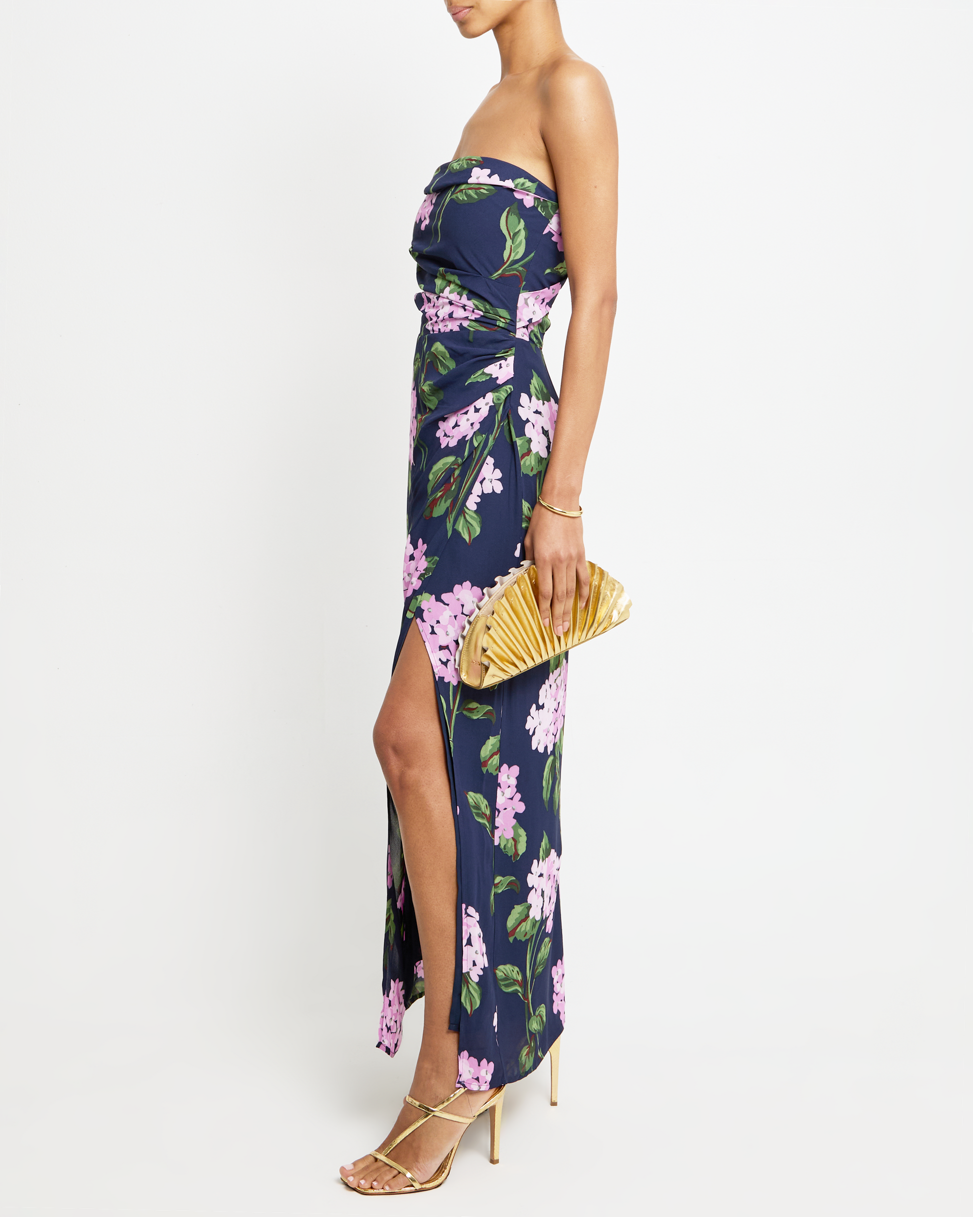 The Malani Dress features a straight neckline, draped material, and a sleek side slit for a modern and sophisticated look. The easy and elegant side ruching ensures the perfect flattering fit.