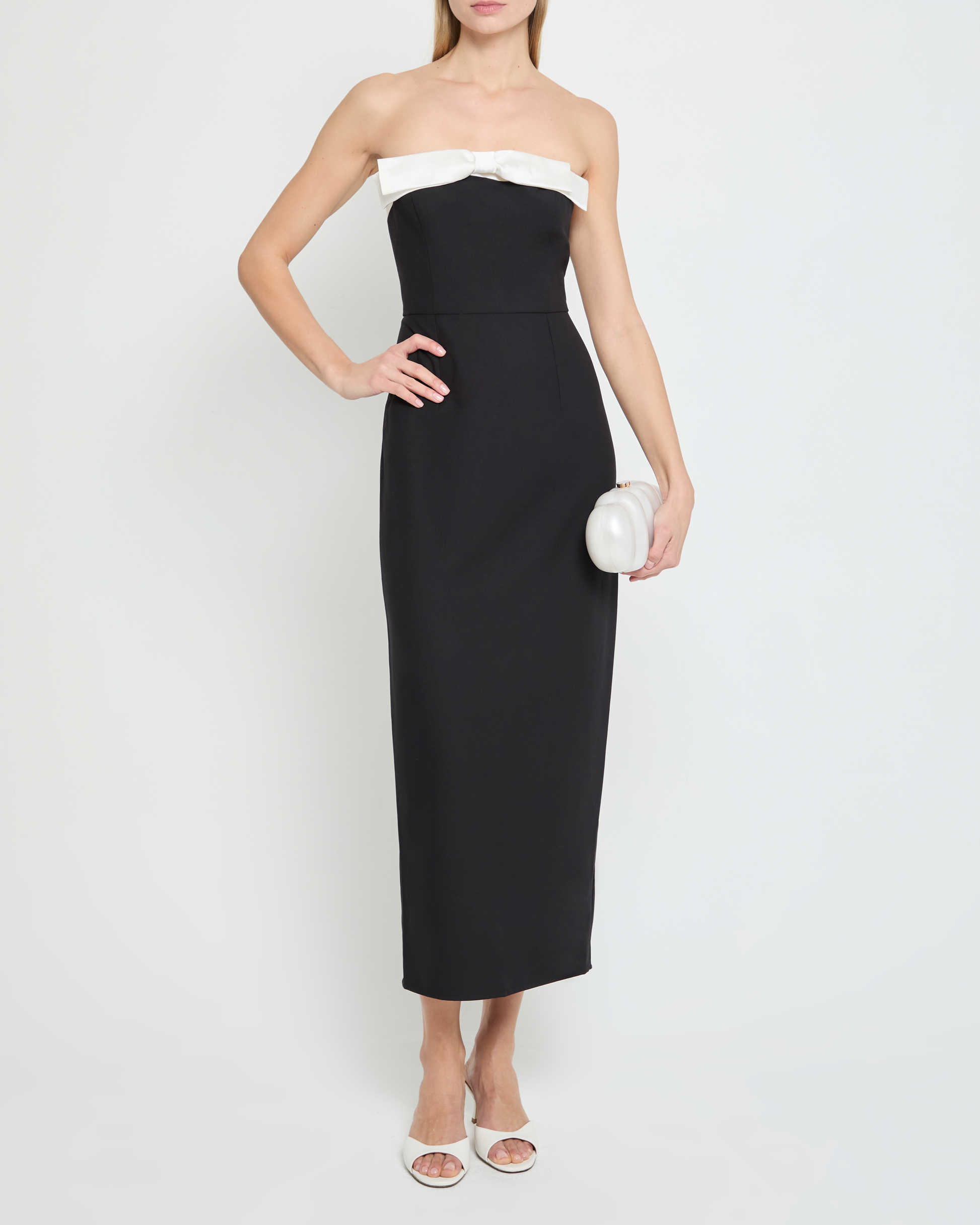The Solana Dress boasts a sleek, fitted sheath silhouette and elegant strapless design, for a timelessly elegant look. The contrasting white bow detail at the neckline exudes classic charm.