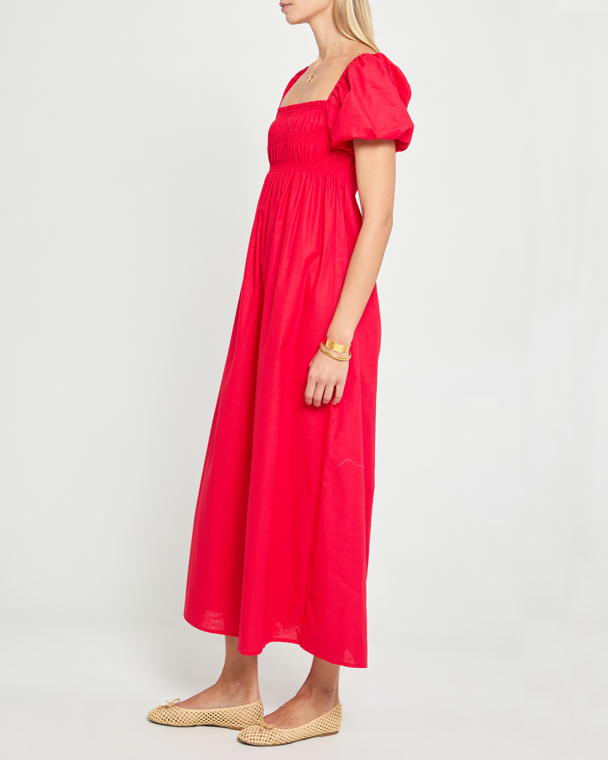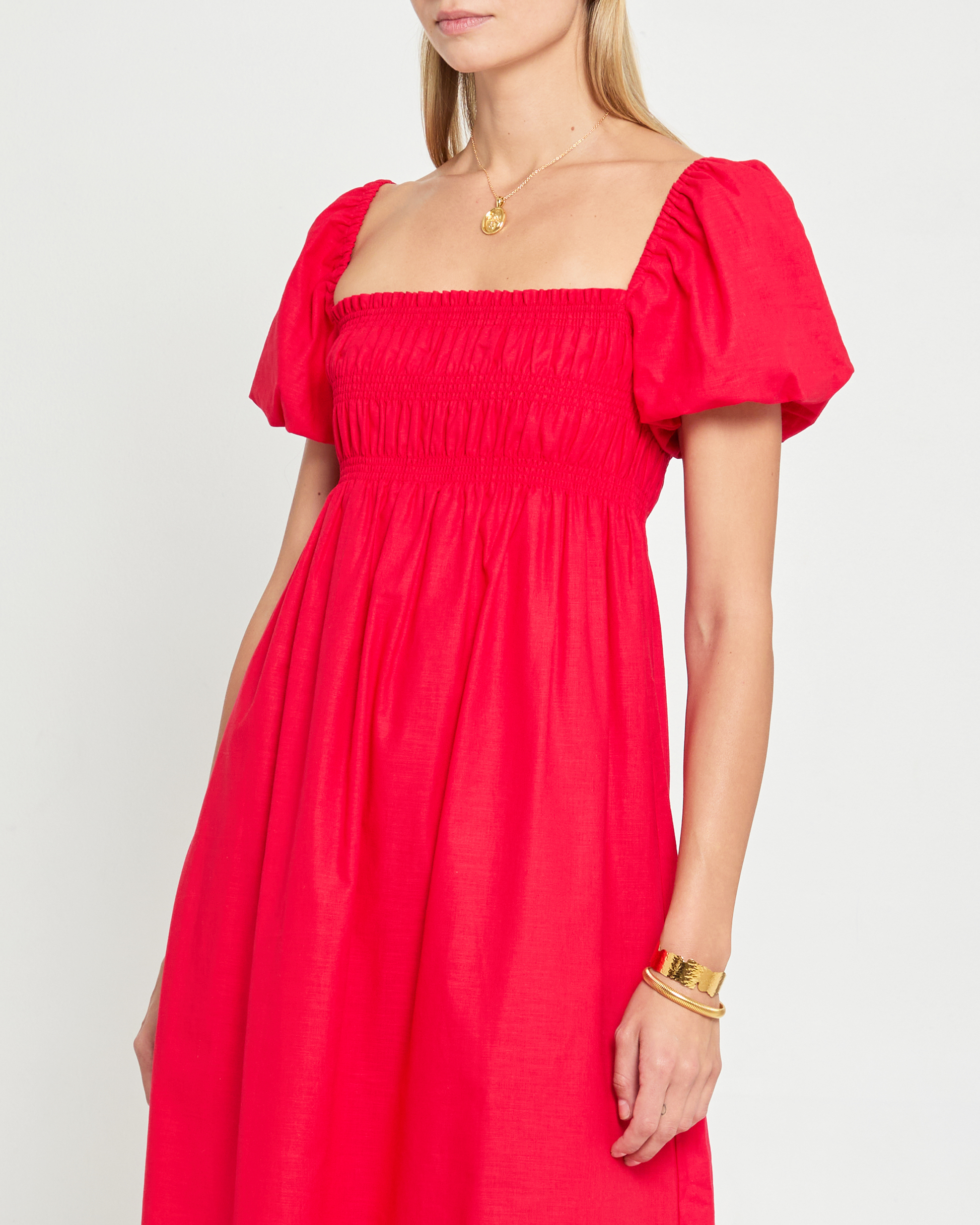 Effortlessly elegant, the Laing Dress features a flattering empire waist and stunning red hue. Its puff sleeves add a touch of romance while the comfortable smocking ensures an easy fit. Make a statement with this versatile and stylish piece.