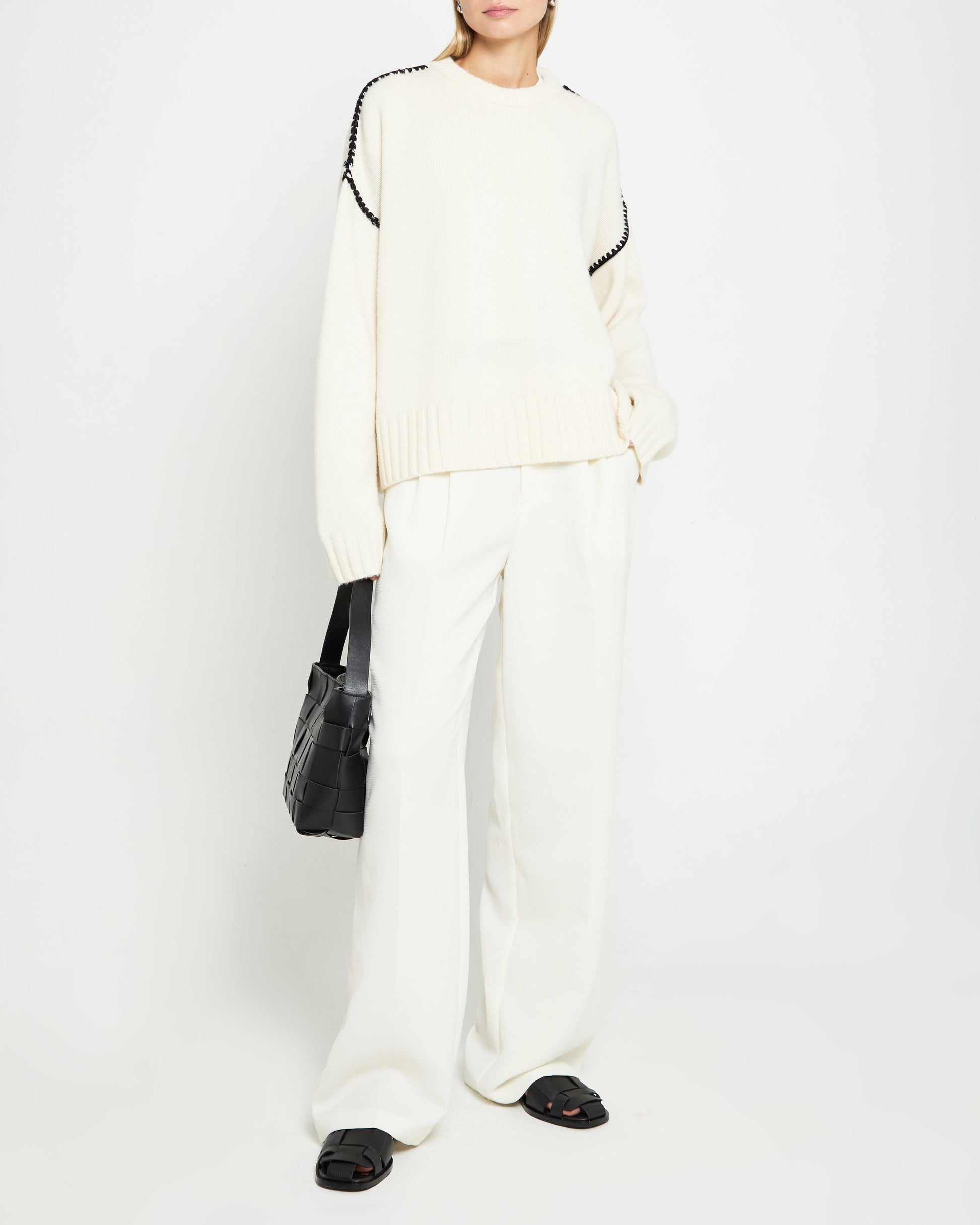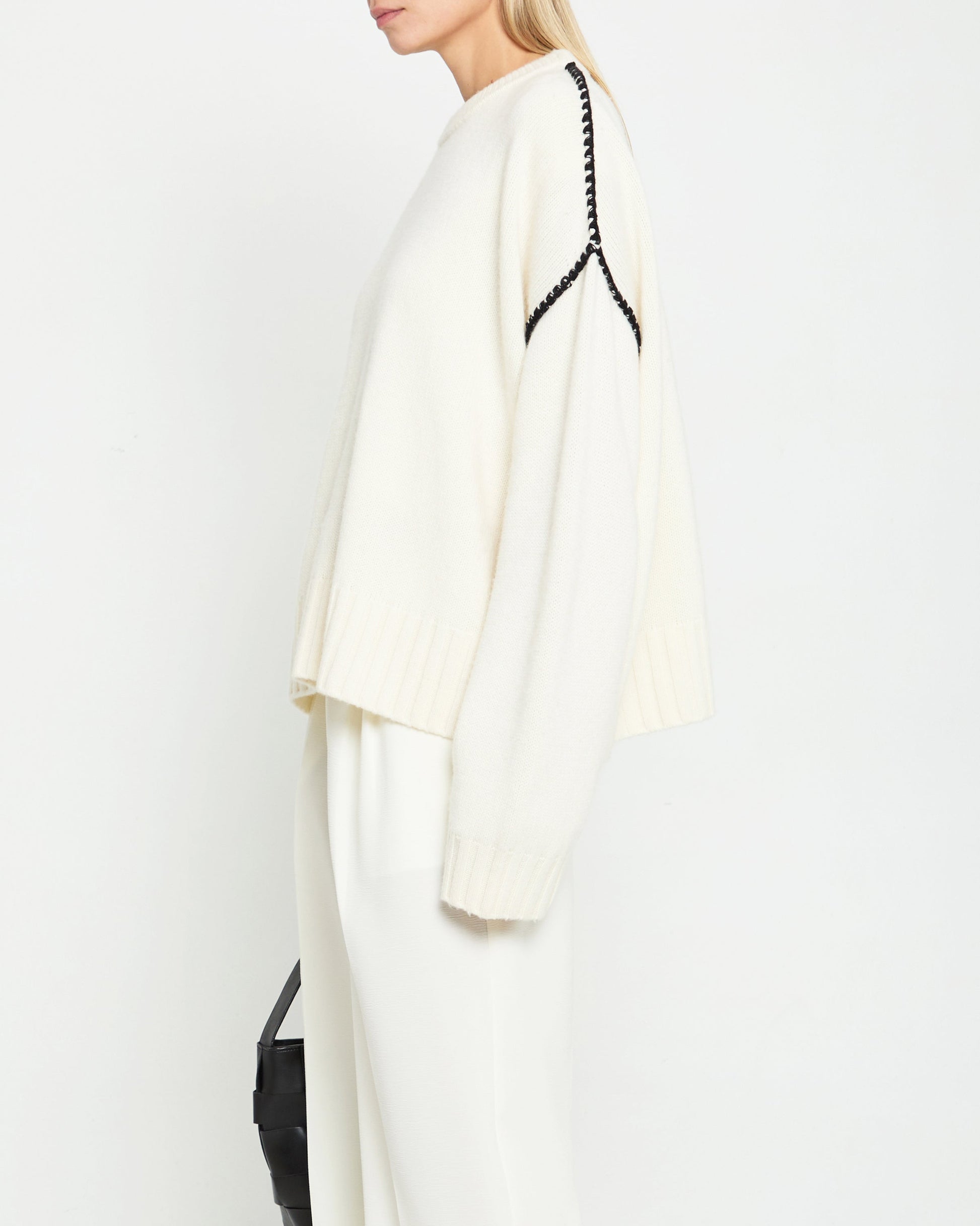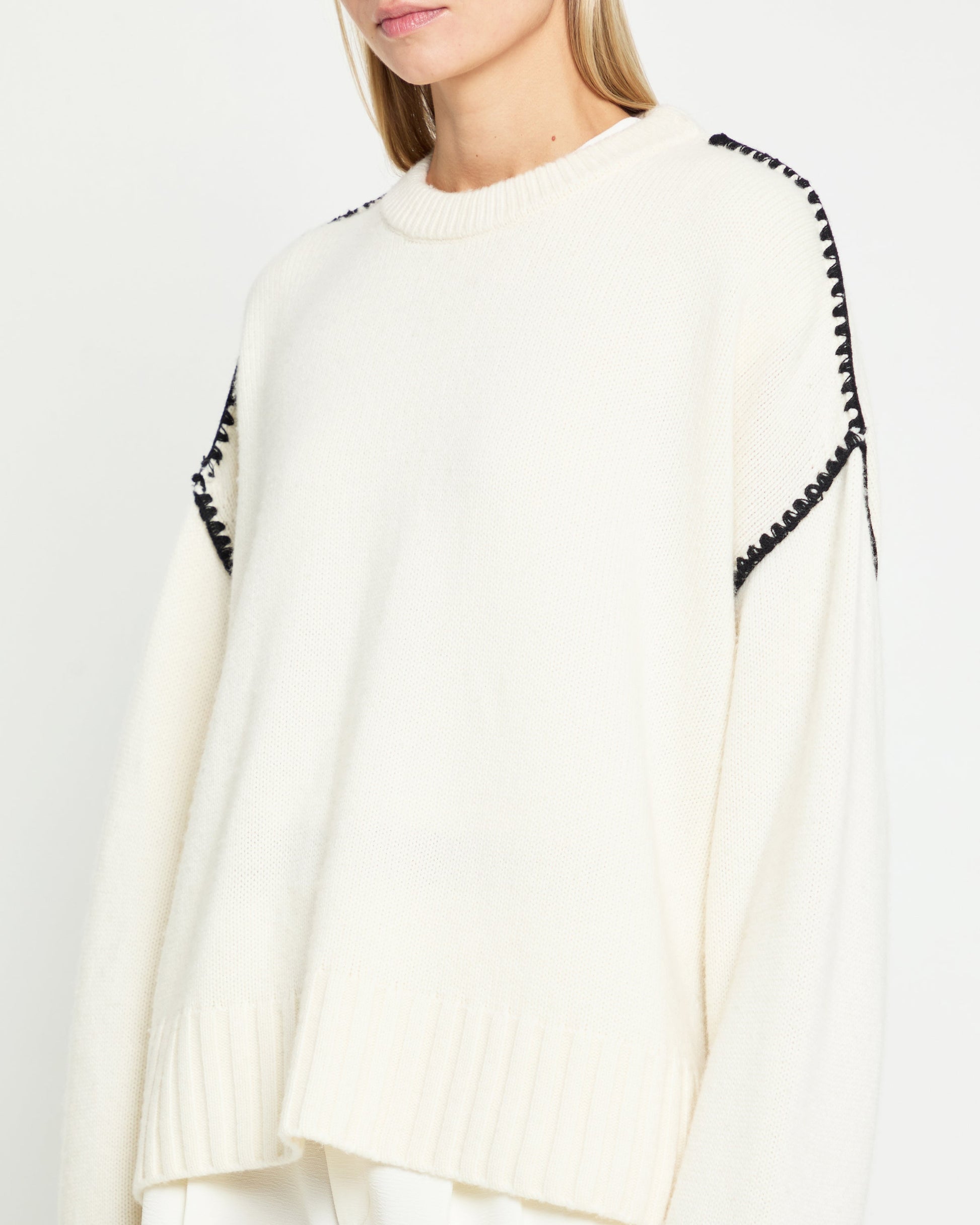 Expertly crafted and designed, the Carla Cashmere-Wool Sweater offers both style and comfort. The crewneck and oversized fit provide a modern silhouette, while the clean cream hue and black embroidery stitching add elegant details. Made with a luxurious blend of cashmere and wool, this sweater is soft and comfy.
