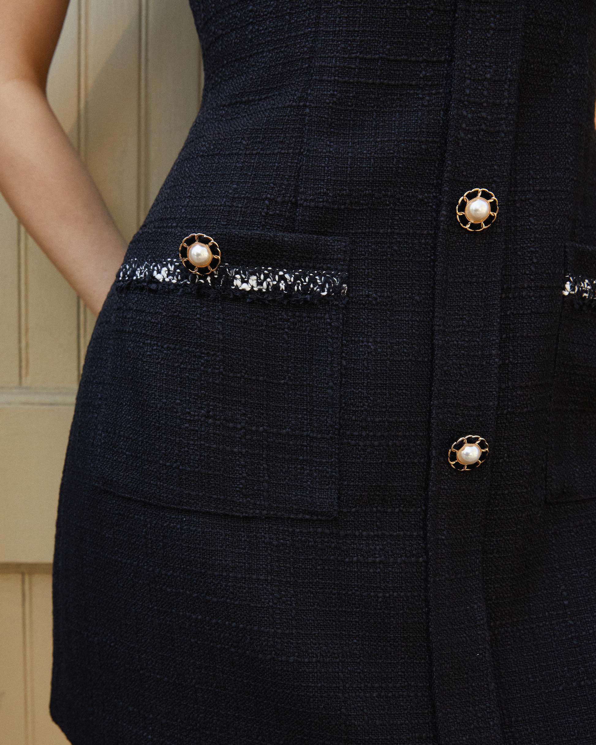 Introducing the Alfie Dress, crafted from luxurious tweed material and adorned with stunning pearl buttons. Exude timeless class in this chic and easy little black dress.