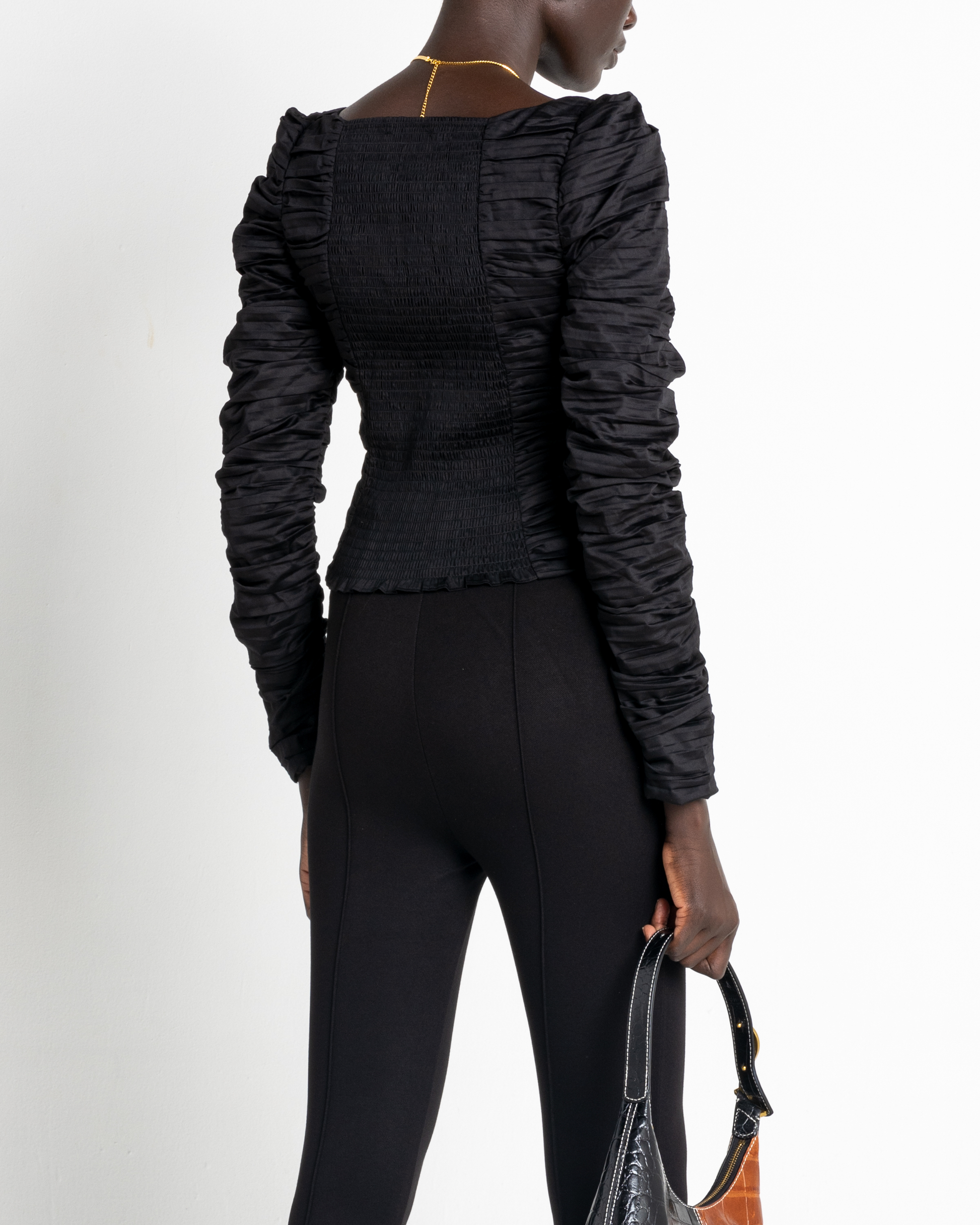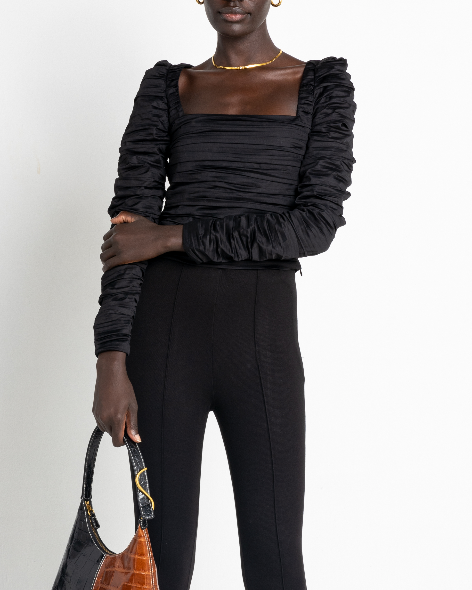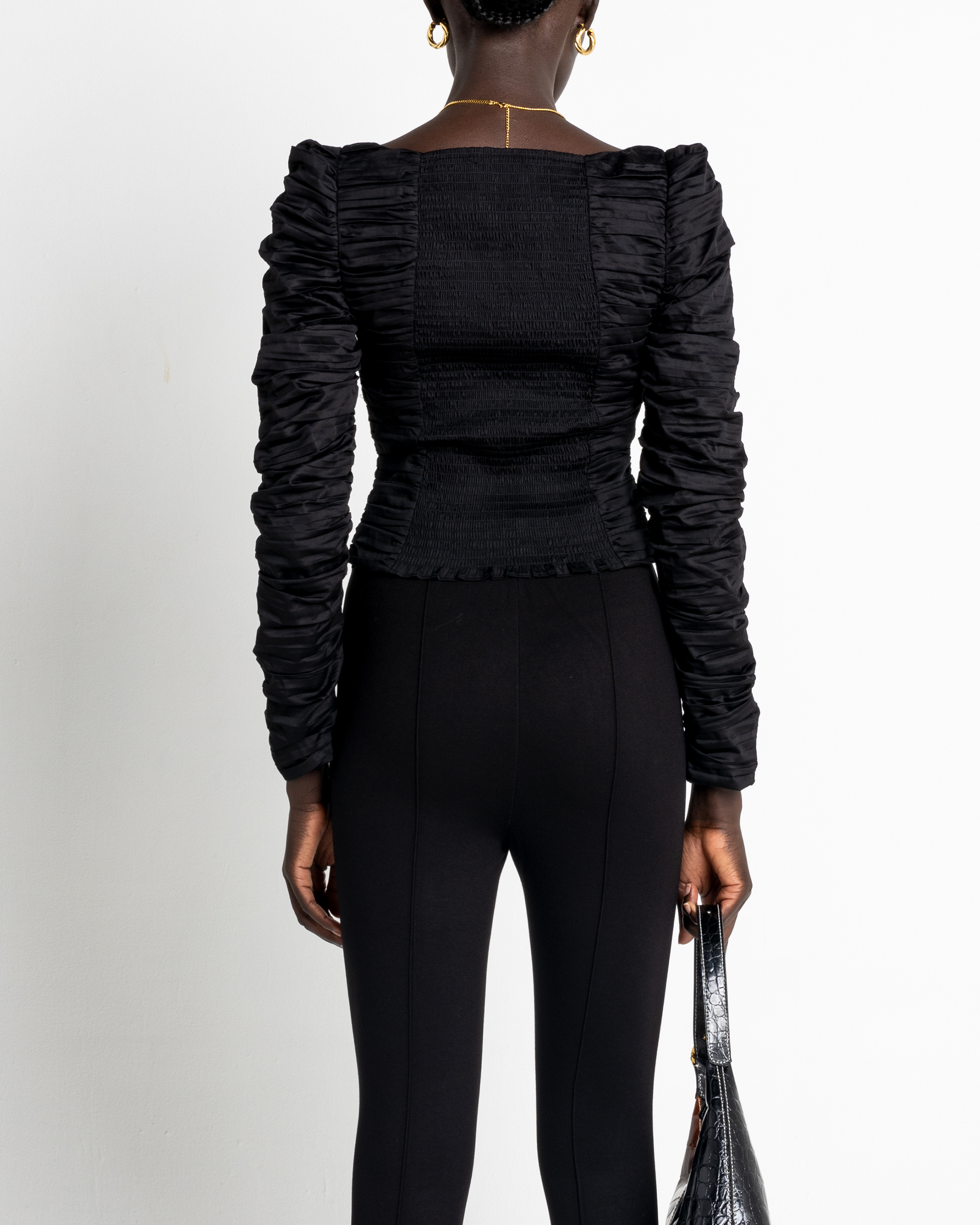 Elevated and chic, this ruched blouse is done in effortless, black cotton. Finished with a square neckline and subtle puffed sleeves.