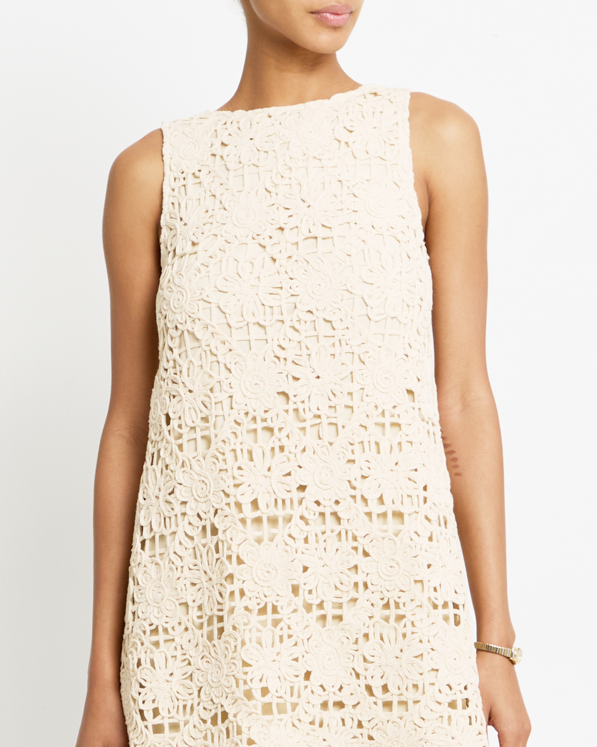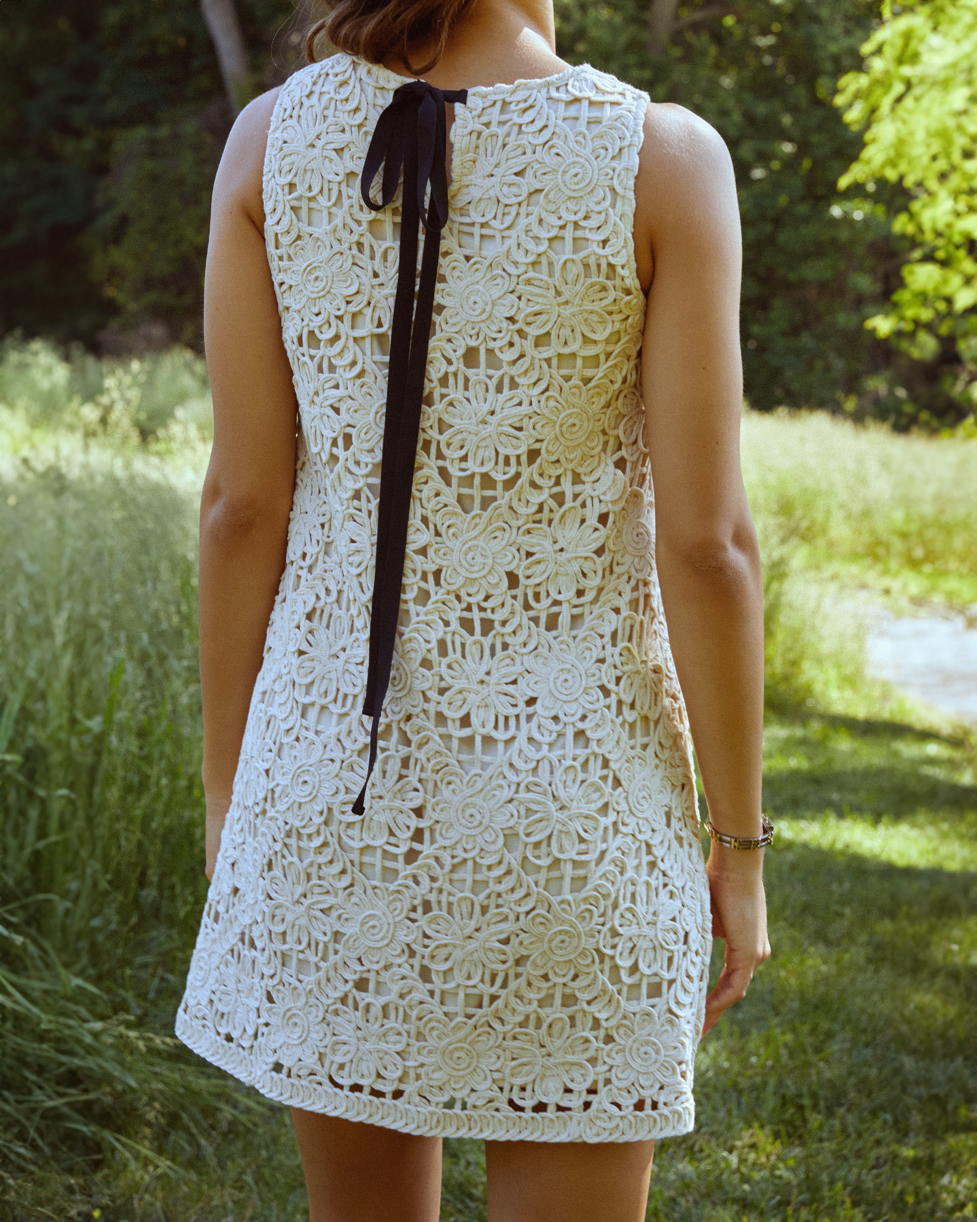 Made of thick cotton crochet, this dress features a high neckline and easy shift design for a flattering fit. The black ribbon detail adds a touch of elegance to this adorable and chic mini dress.