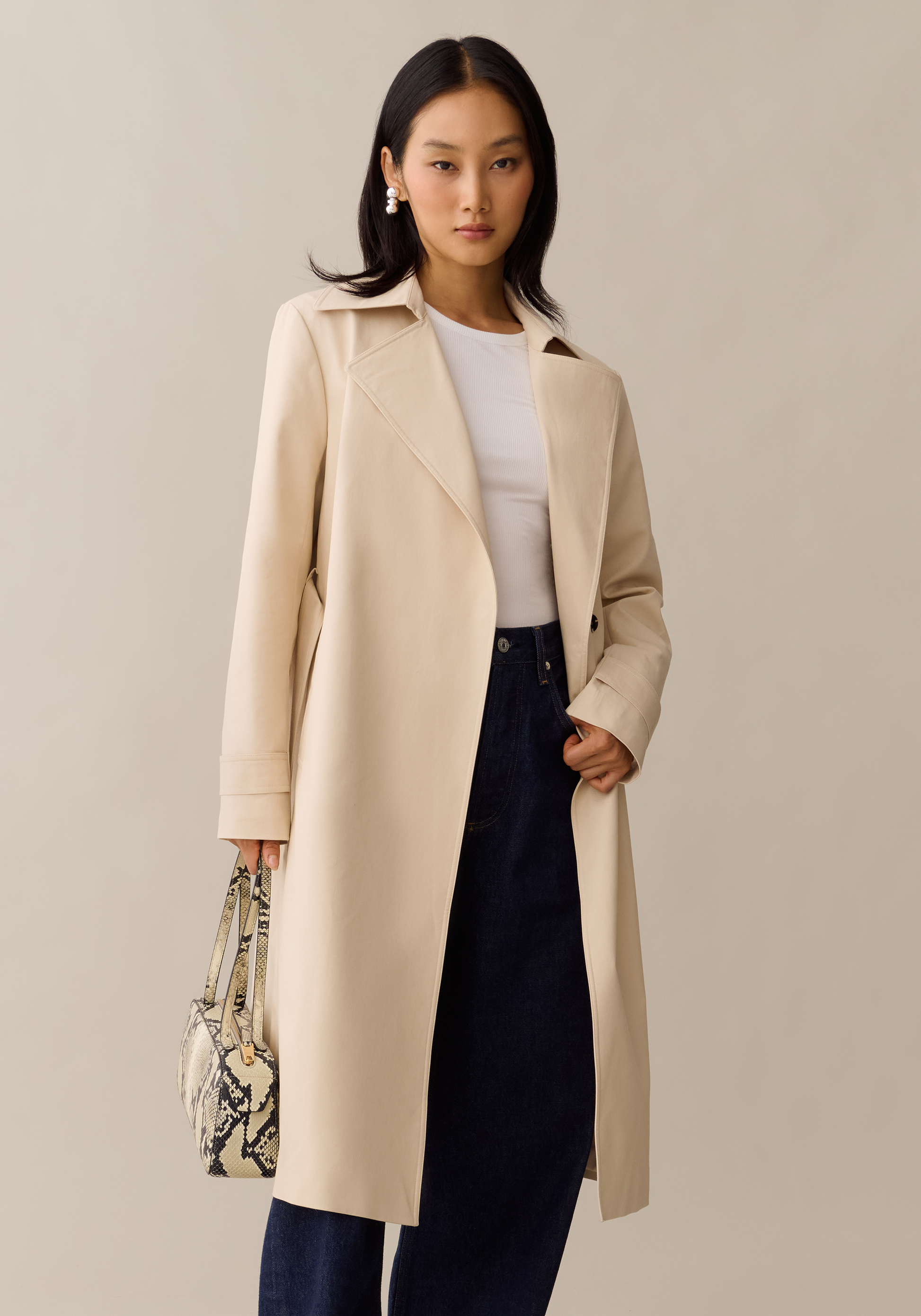 The clean and chic design of the Gale Trench Coat is highlighted by its simple, classic silhouette. The adjustable belt ensures a tailored fit, while the soft neutral hue adds versatility and understated elegance. Don't miss this timeless staple piece.