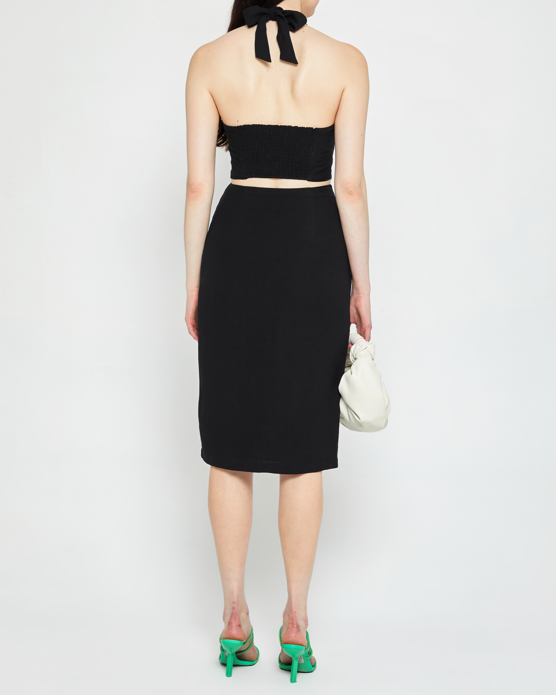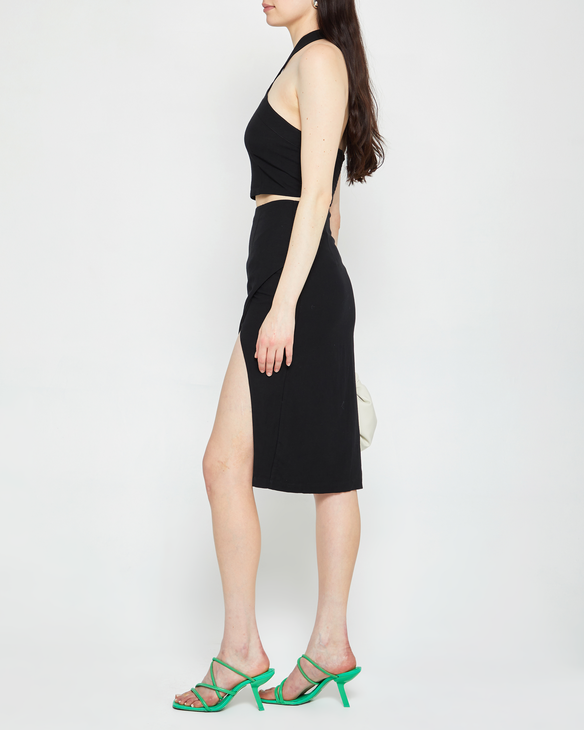 This sweet top is done with an adjustable halter neck tie in a cropped silhouette. Done with a matching skirt with a cool side slit.
