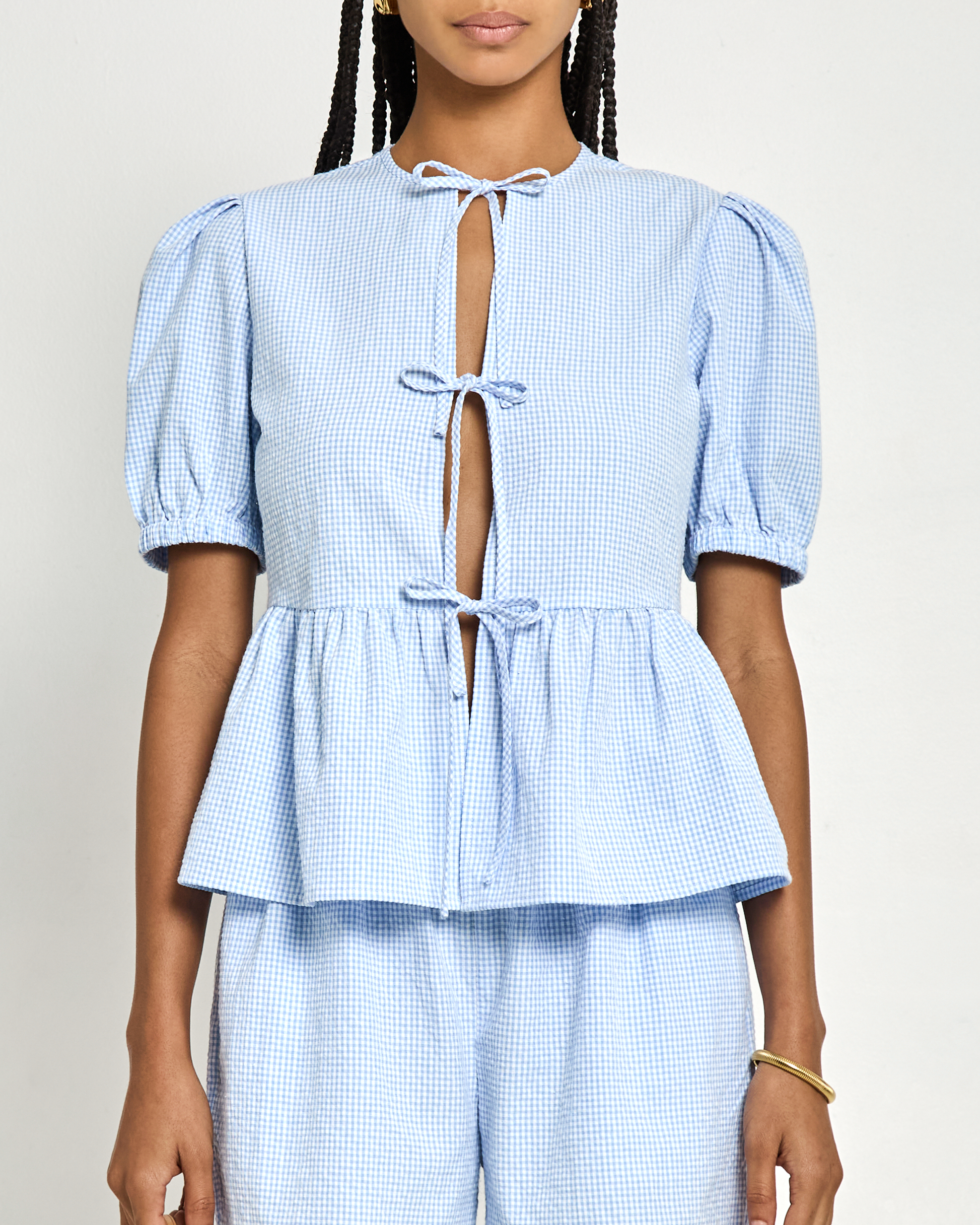 Effortlessly charming, the Una Set features front ties and puff sleeves for a sweet touch. In a light blue gingham pattern, it boasts a relaxed fit and comfortable feel for a perfect blend of style and comfort.