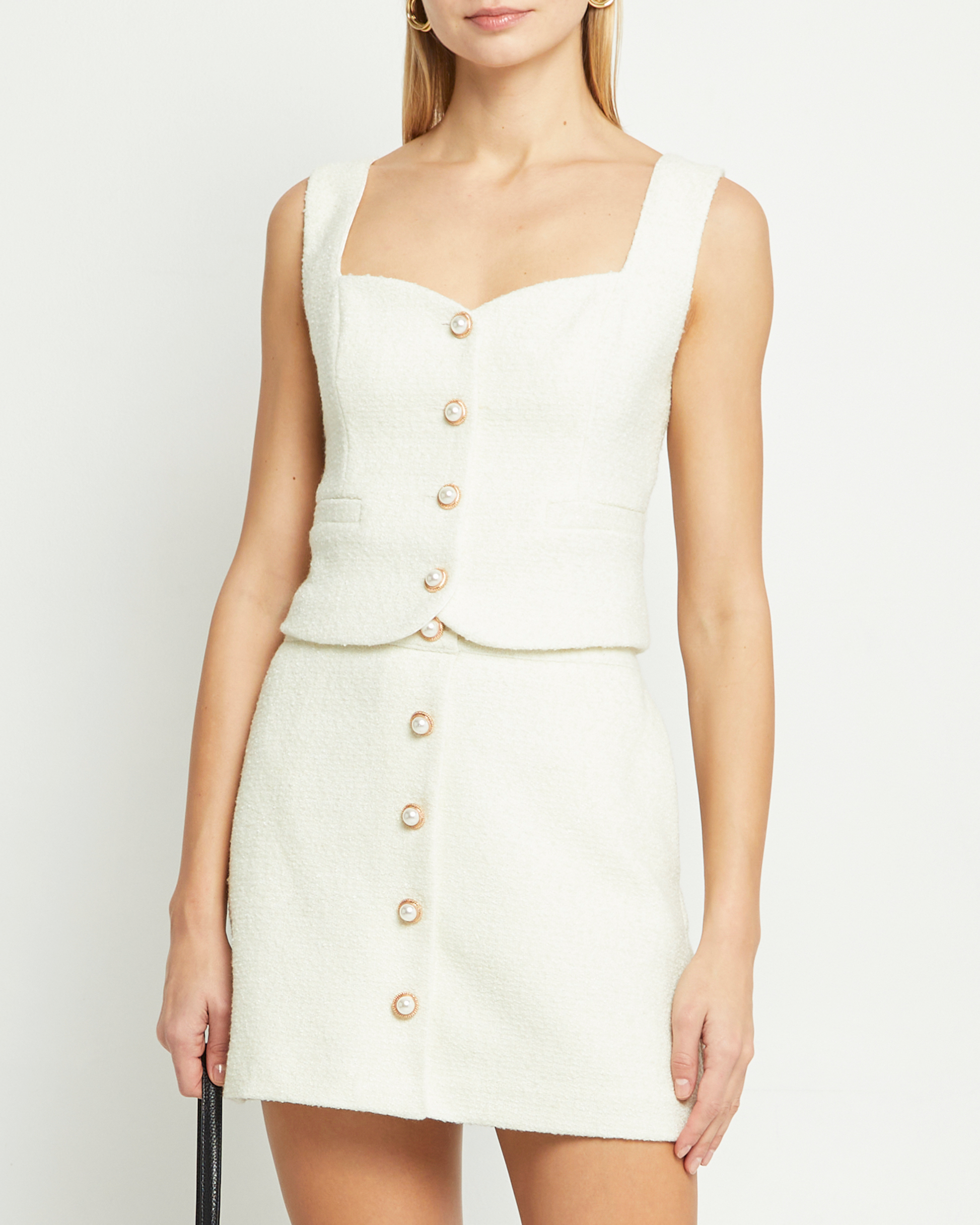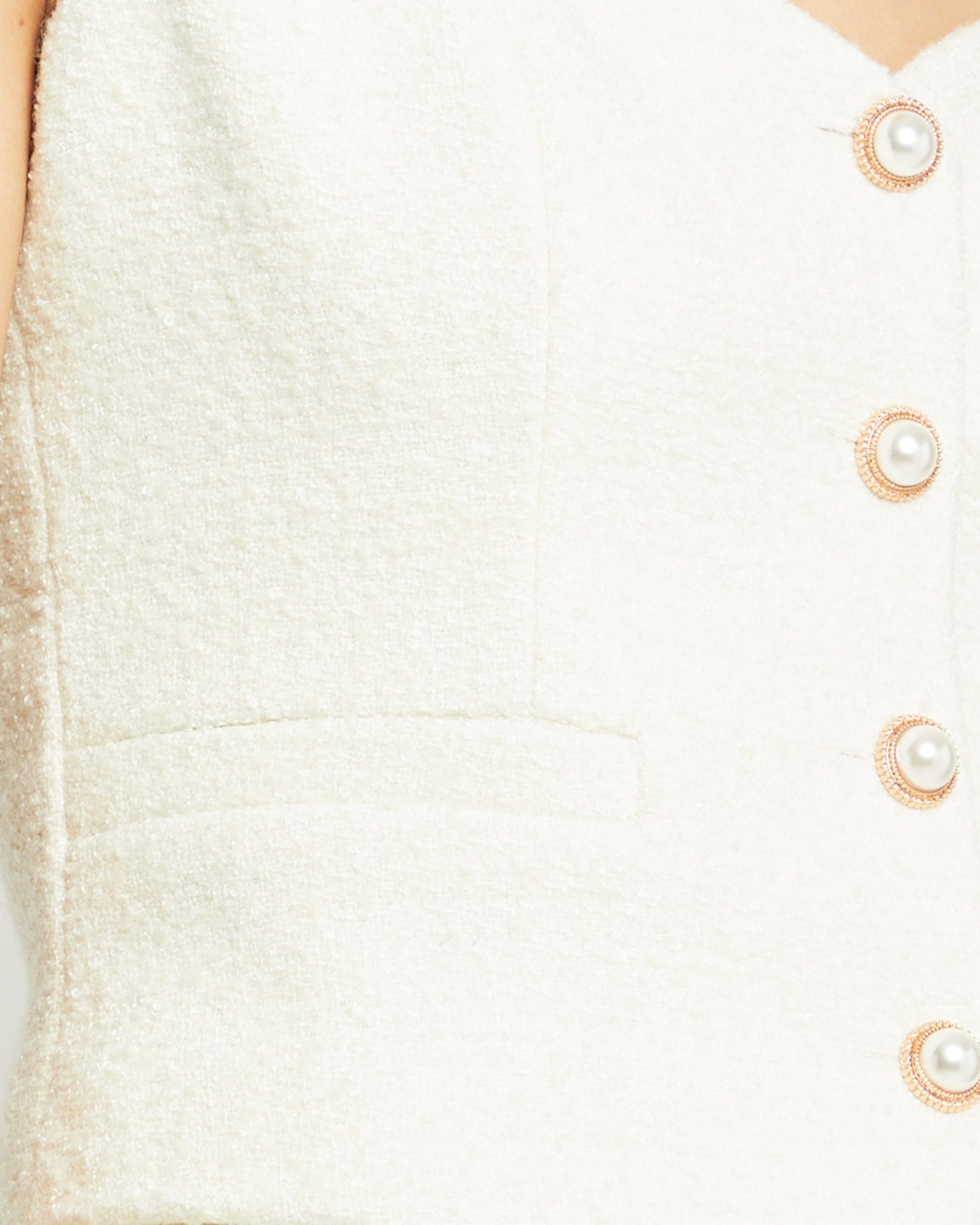 The Beckett Top features a flattering sweetheart neckline and thick adjustable straps for a comfortable and customizable fit. It is adorned with decorative pocket details and accented with pearl and gold buttons, giving it an elegant finish.