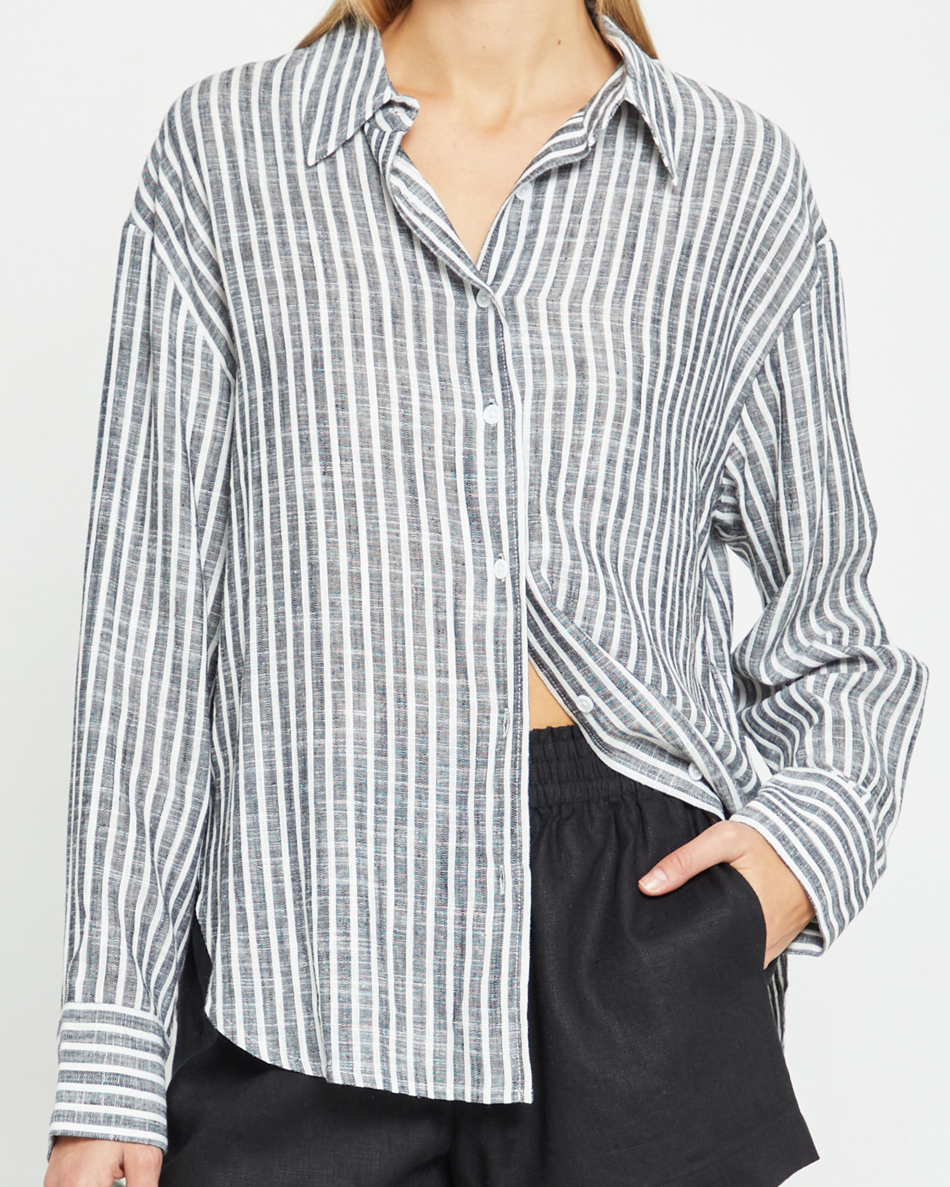 The perfect staple piece, this classic button-up can be worn on its own or effortlessly layered. Done in a premium linen blend with a relaxed, oversized fit.