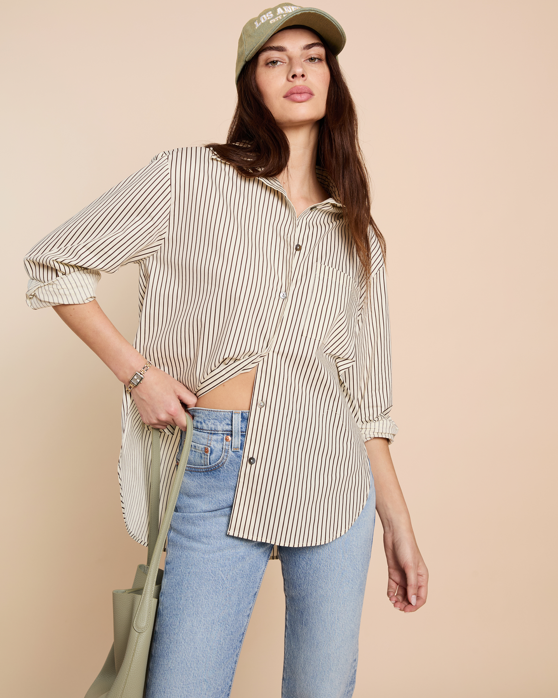 The Noemi Shirt showcases elegant soft brown stripes on a classic collared silhouette. This preppy button-up transitions seamlessly from standalone statement to layering essential. Perfect for achieving that polished yet effortless look in any wardrobe.