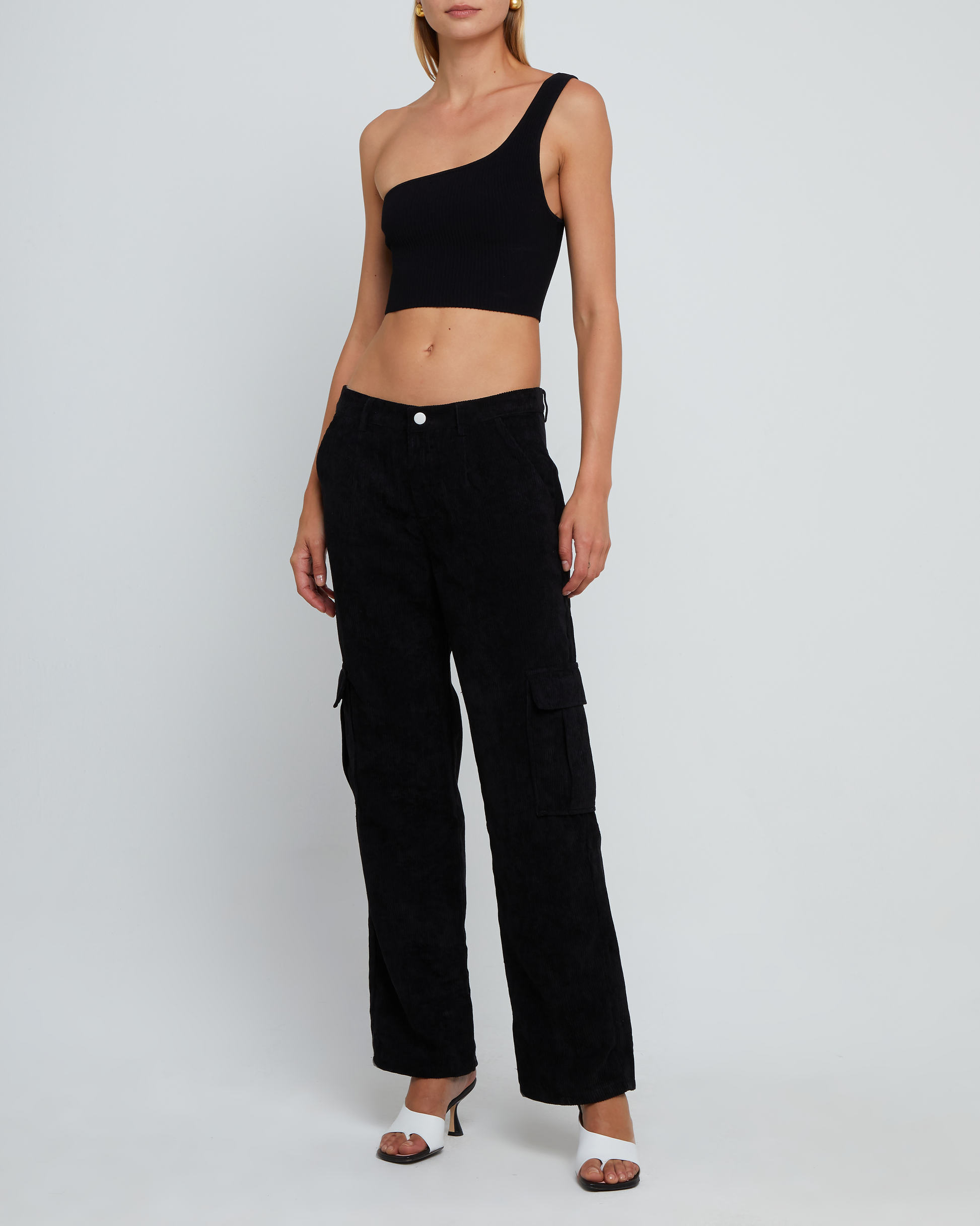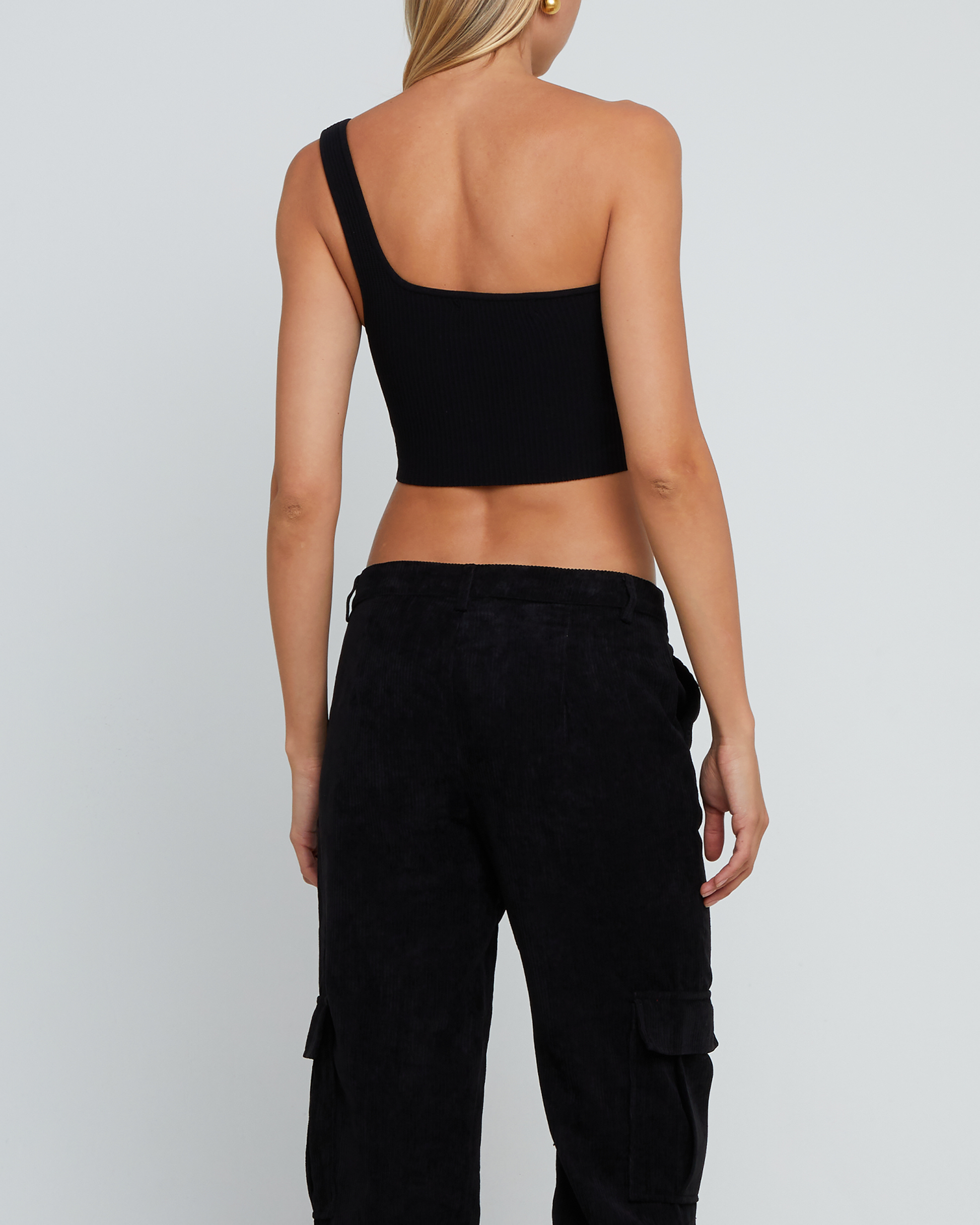 Effortlessly cool, this top features an on-trend asymmetrical neckline. Done in a cropped silhouette with our new stretchy ribbed knit material.