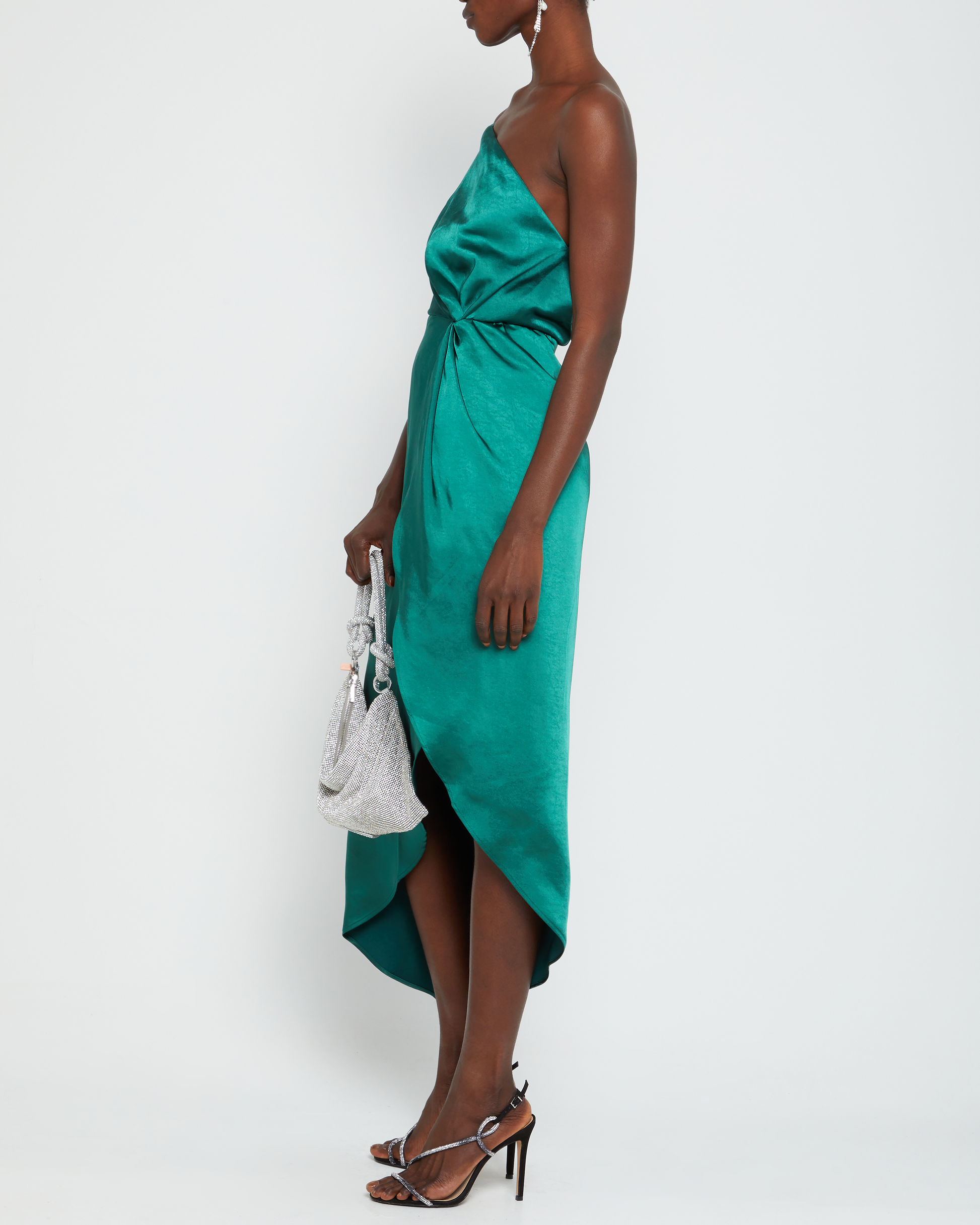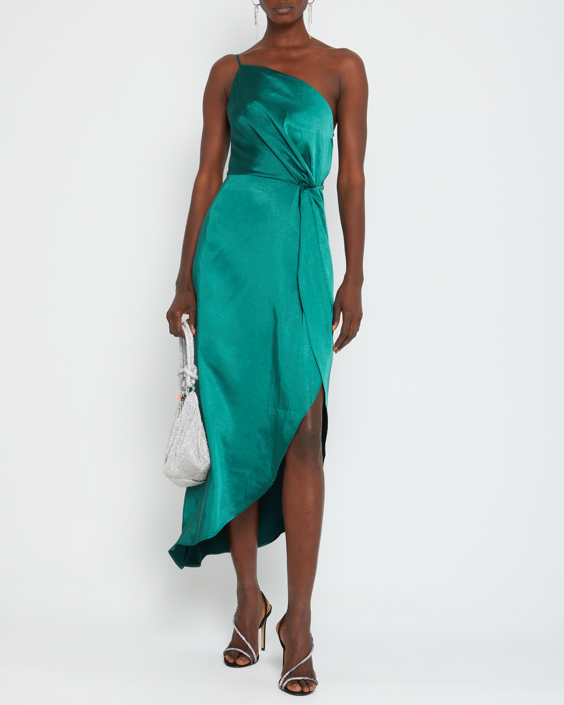 We love the asymmetrical, one-shoulder neckline on this simple yet chic dress. Done in a satin material and finished with flattering gathering at the waist.