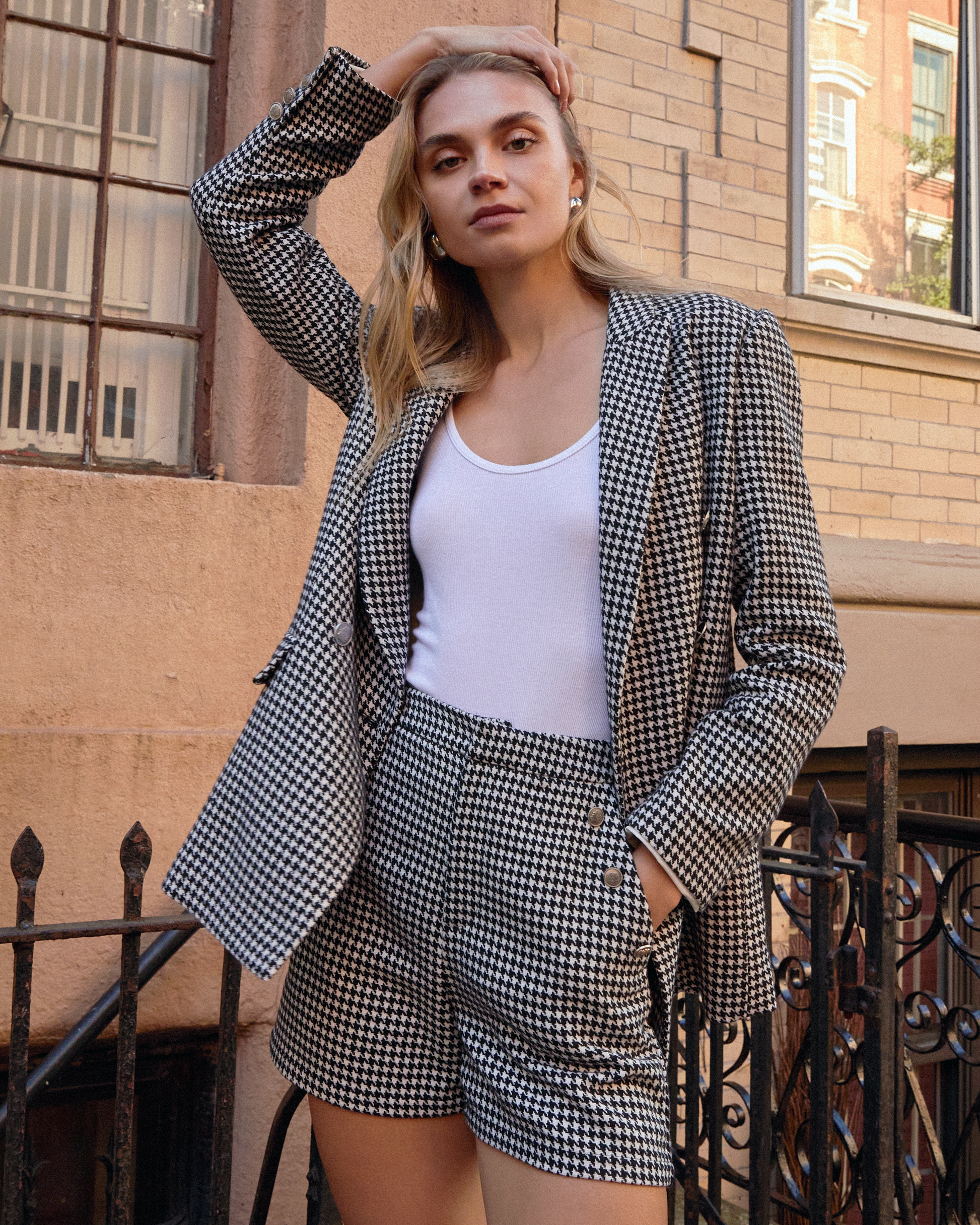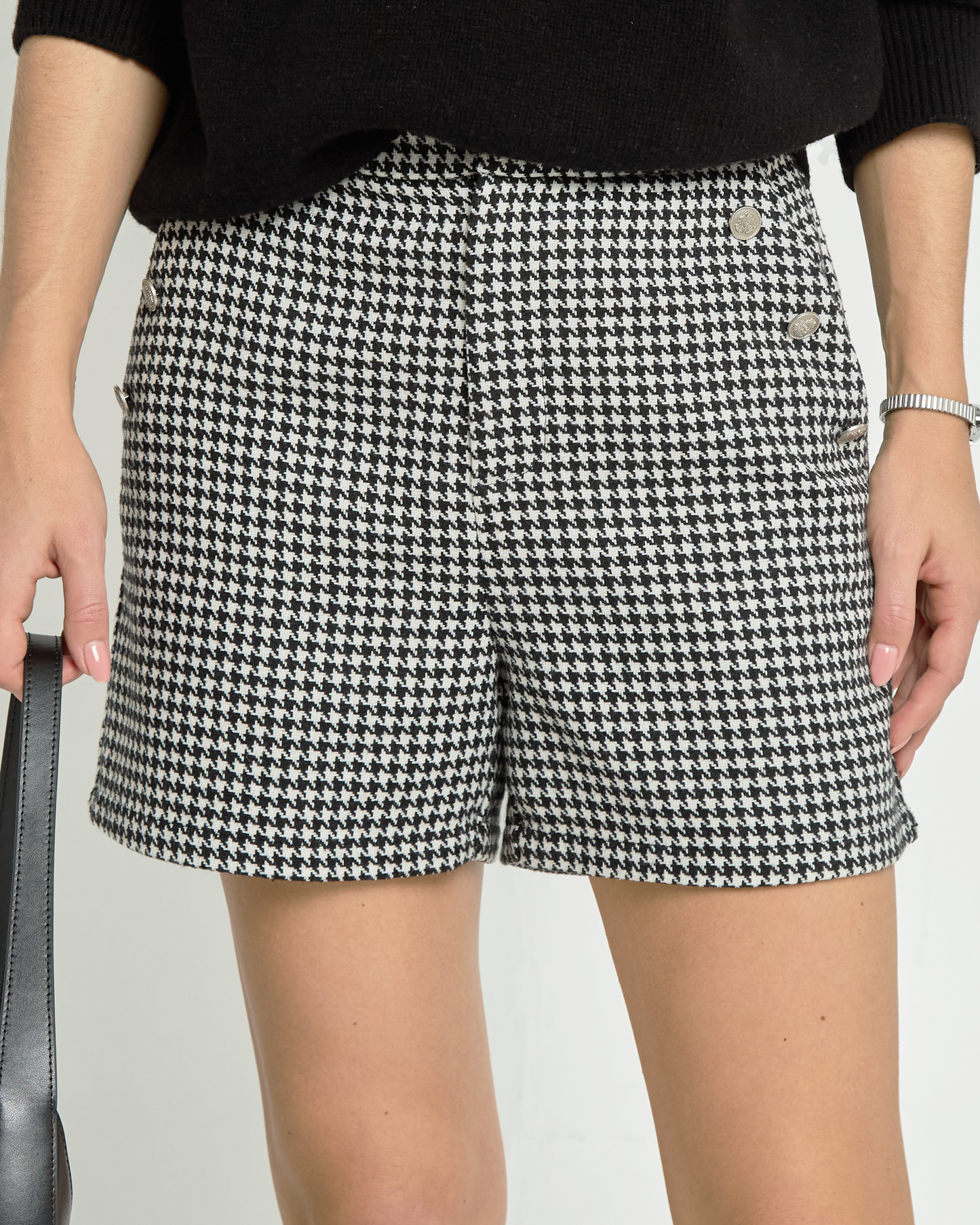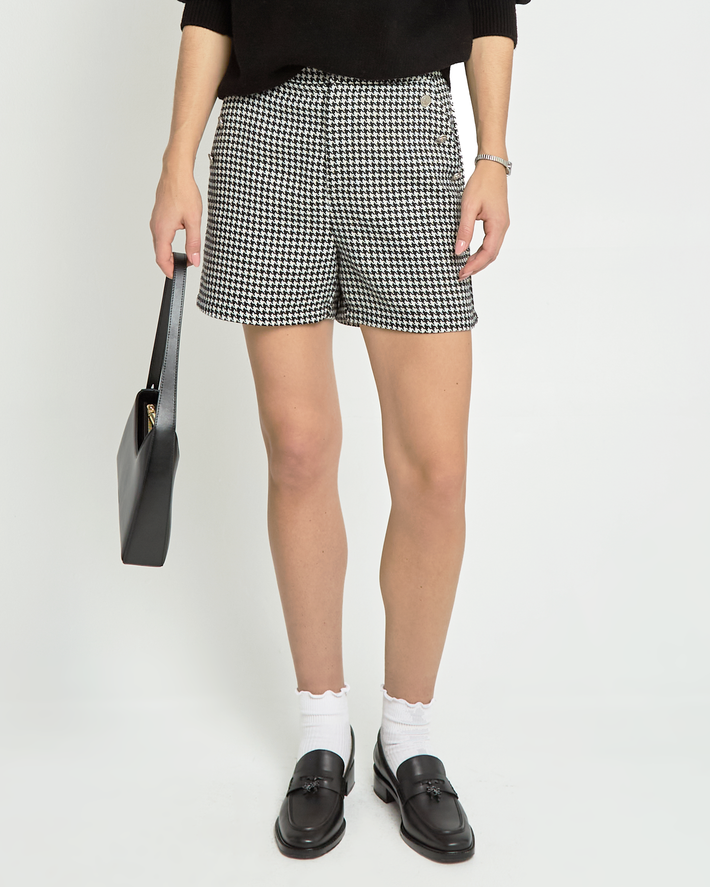 Elevate your style with Blythe Shorts. These mid-rise shorts feature button details and a classic black and white houndstooth print that effortlessly matches with any outfit. Perfect for any occasion, these elevated shorts are a must-have in your wardrobe.