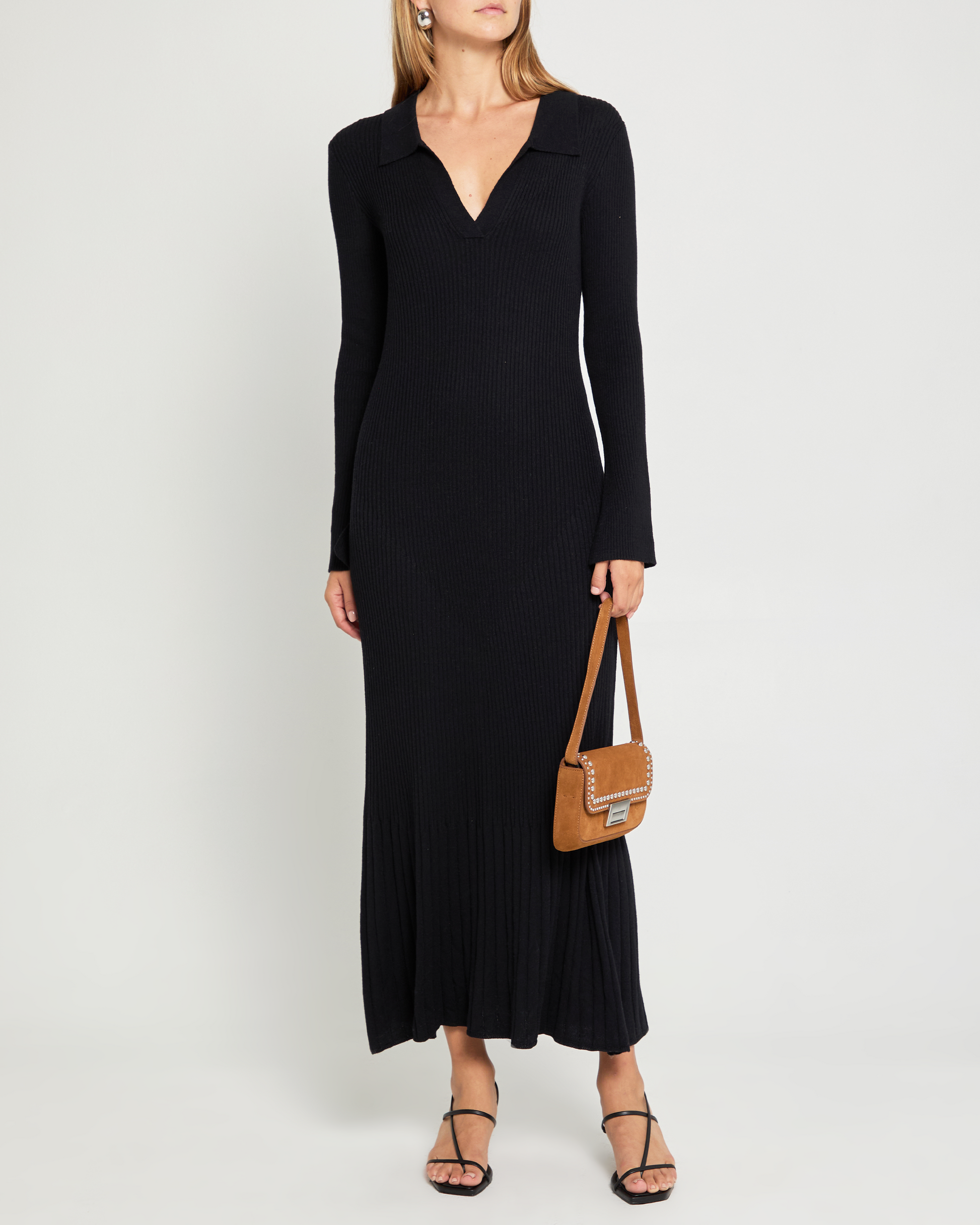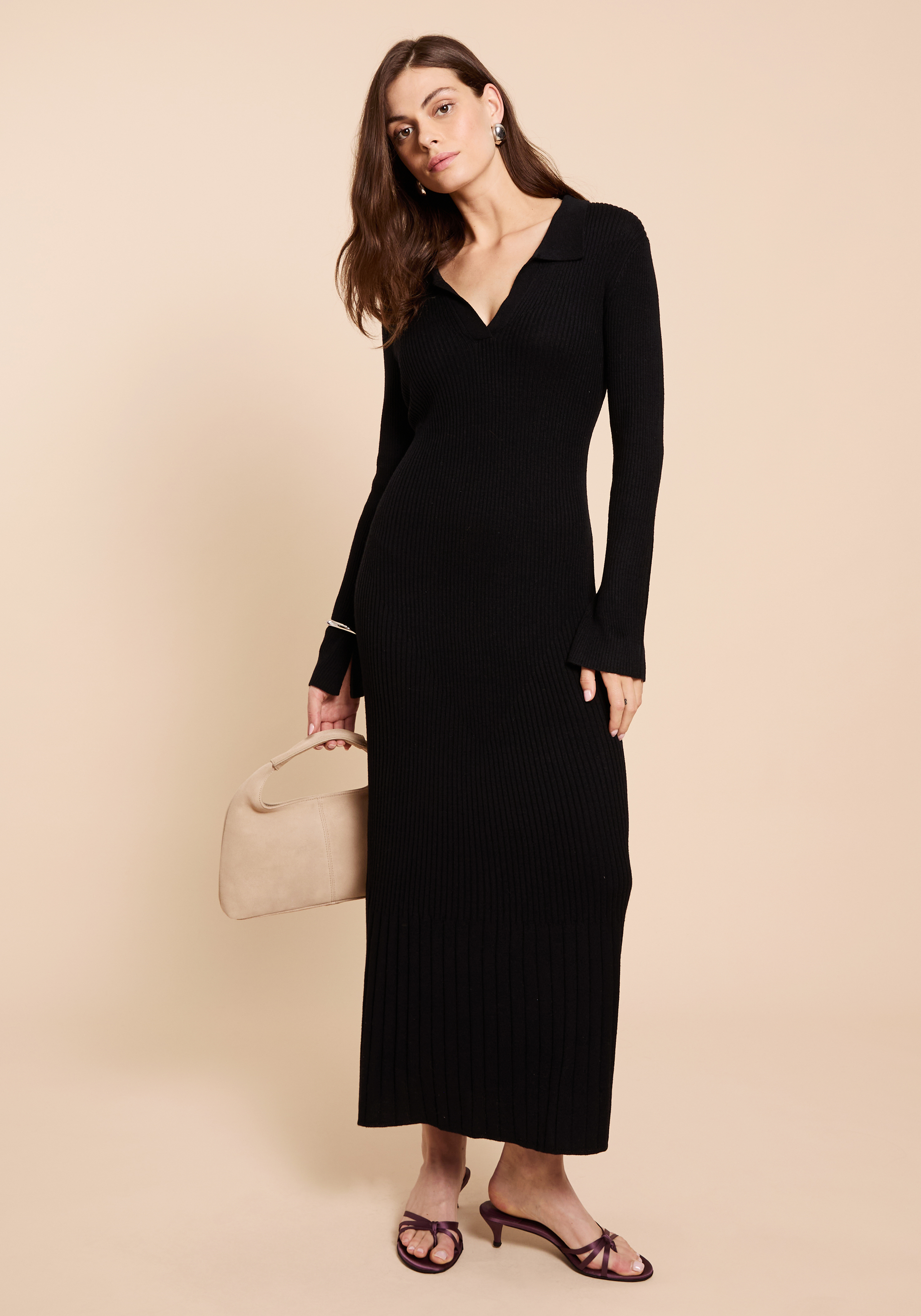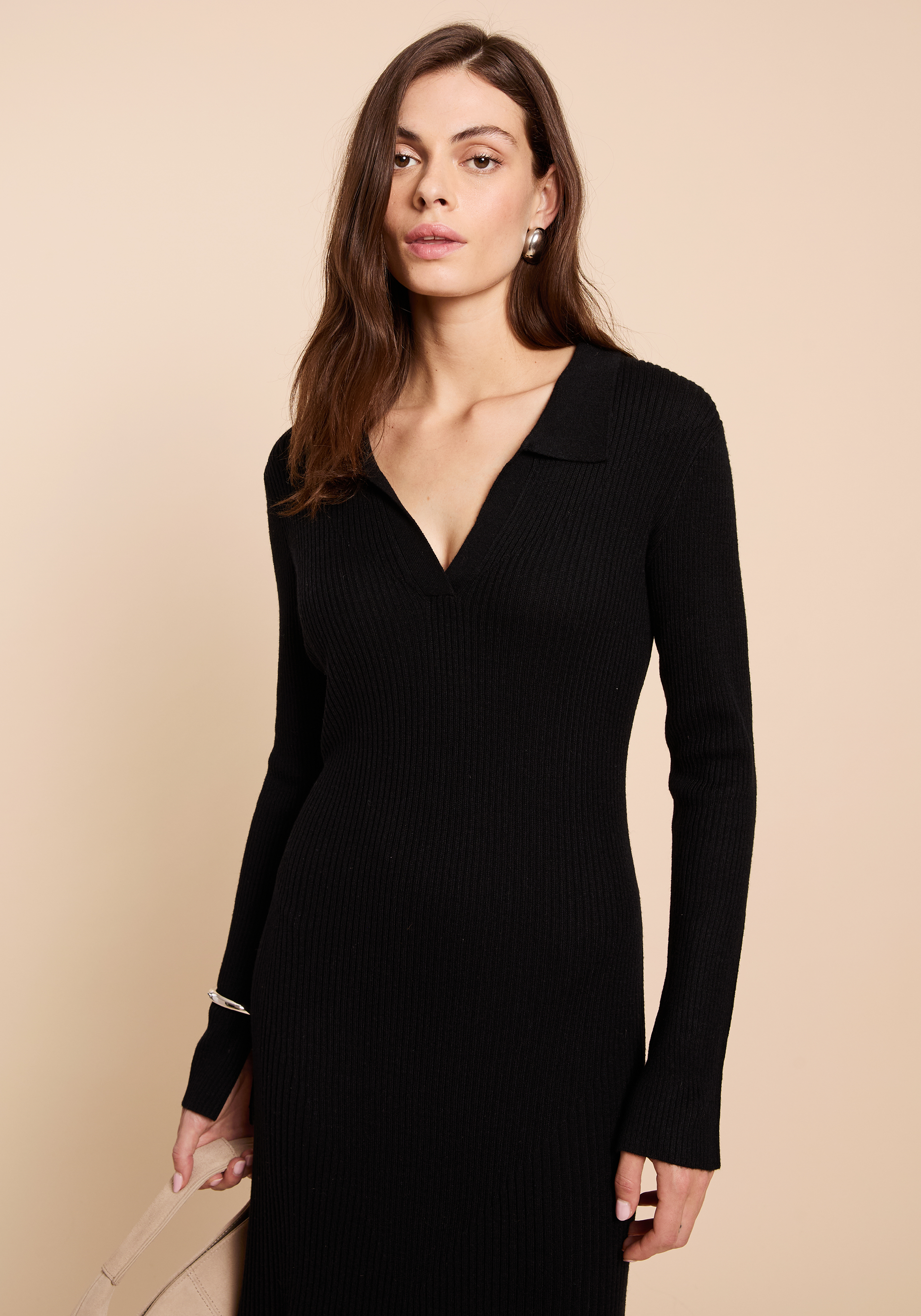 Done in an easy classic hue, this soft sweater dress can easily be dressed up or down. Designed with a variety of ribbed knit patterns for a flattering fit and finished with a cool, collar detail.