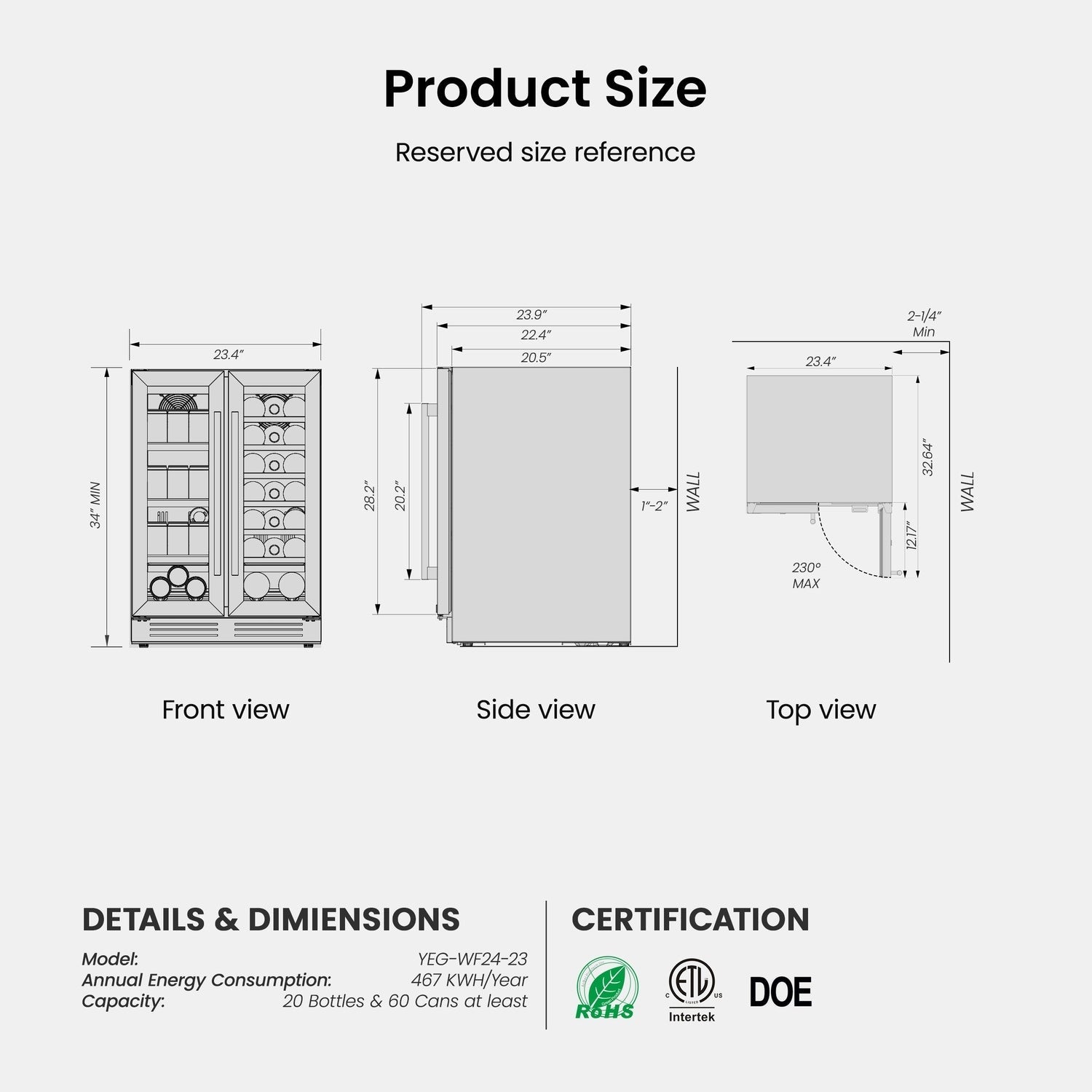 24 Inch Wine/Beverage Refrigerator Cooler, 20 Bottle/60 Can...