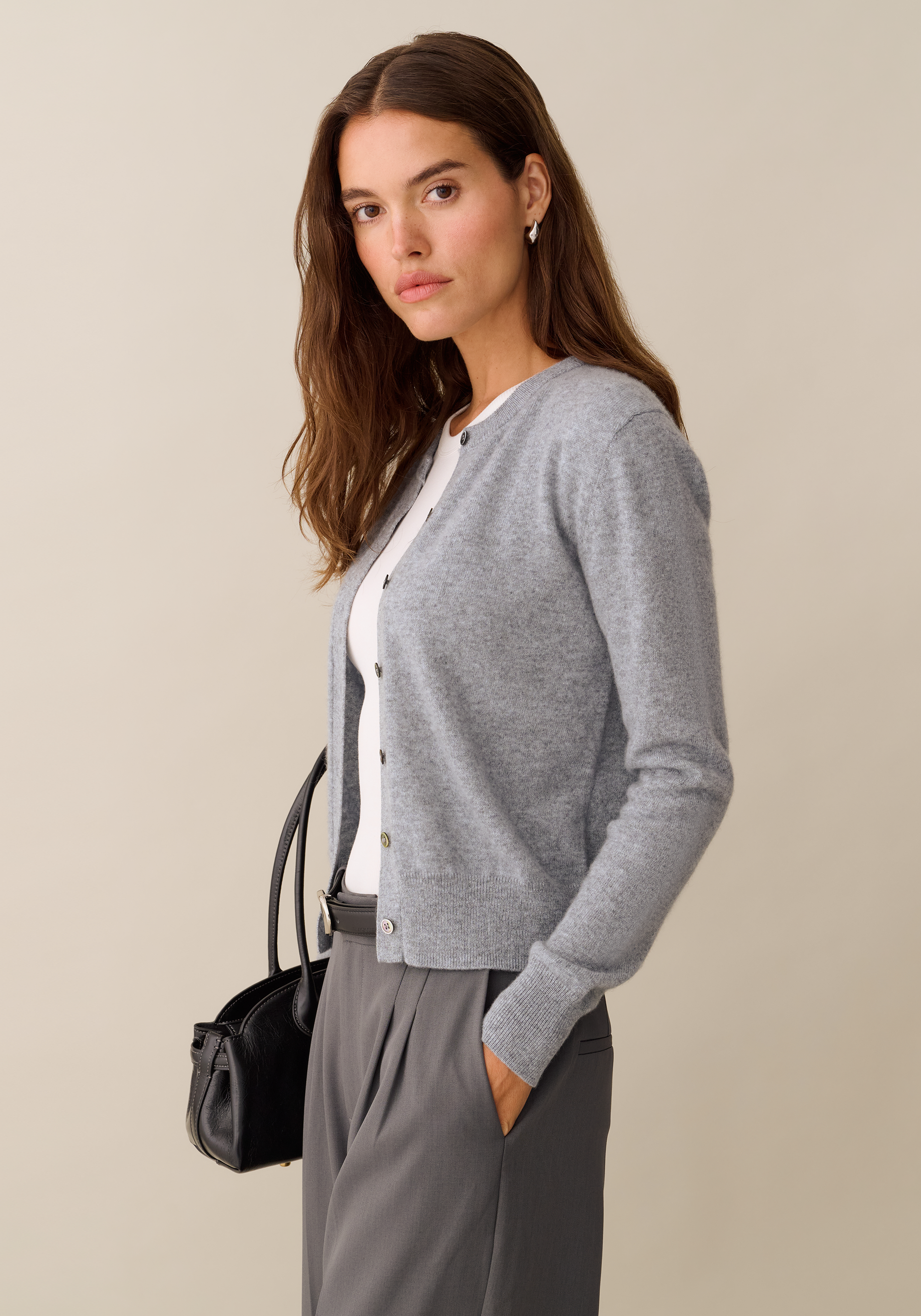 Indulge in luxury with our Finley Cashmere Cardigan. This versatile must-have boasts a cool grey hue and elegant mother of pearl buttons. Elevate your wardrobe with our high-quality, comfortable and stylish cardigan.