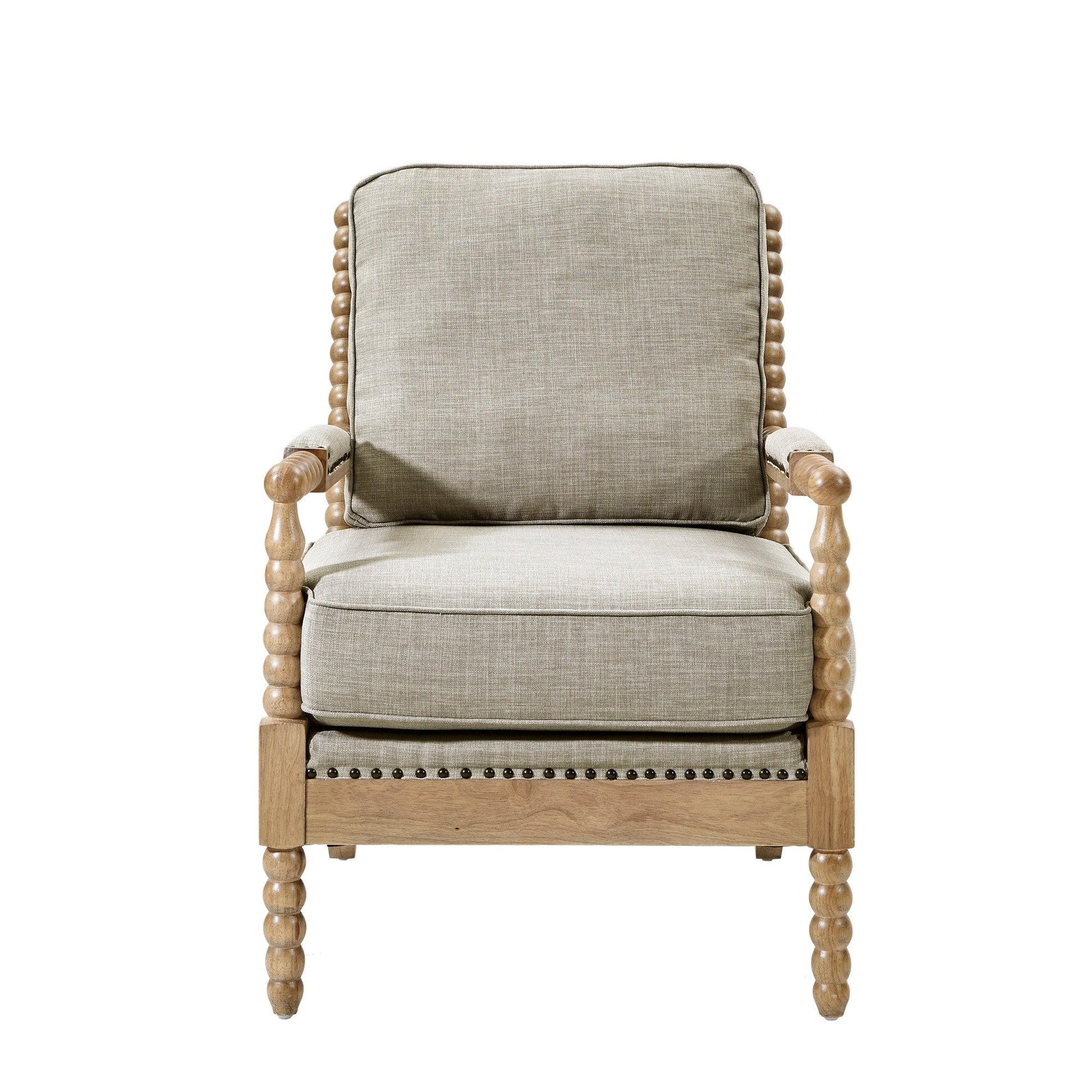Elevate your space with the Madison Park Donohue Wooden Arm Chair, a perfect blend of classic charm and modern comfort. Featuring an open-back spindle design with turned wood detailing, this accent chair with arms exudes timeless appeal. The tightly woven fabric upholstery enhances durability while resisting pilling, and the plush multi-layered foam seat ensures lasting support. Padded arms add extra comfort, while bronze nailhead trim lends a refined touch. A versatile accent chair for living rooms, bedrooms, or reading nooks. Complete your space with this timeless accent chair today!