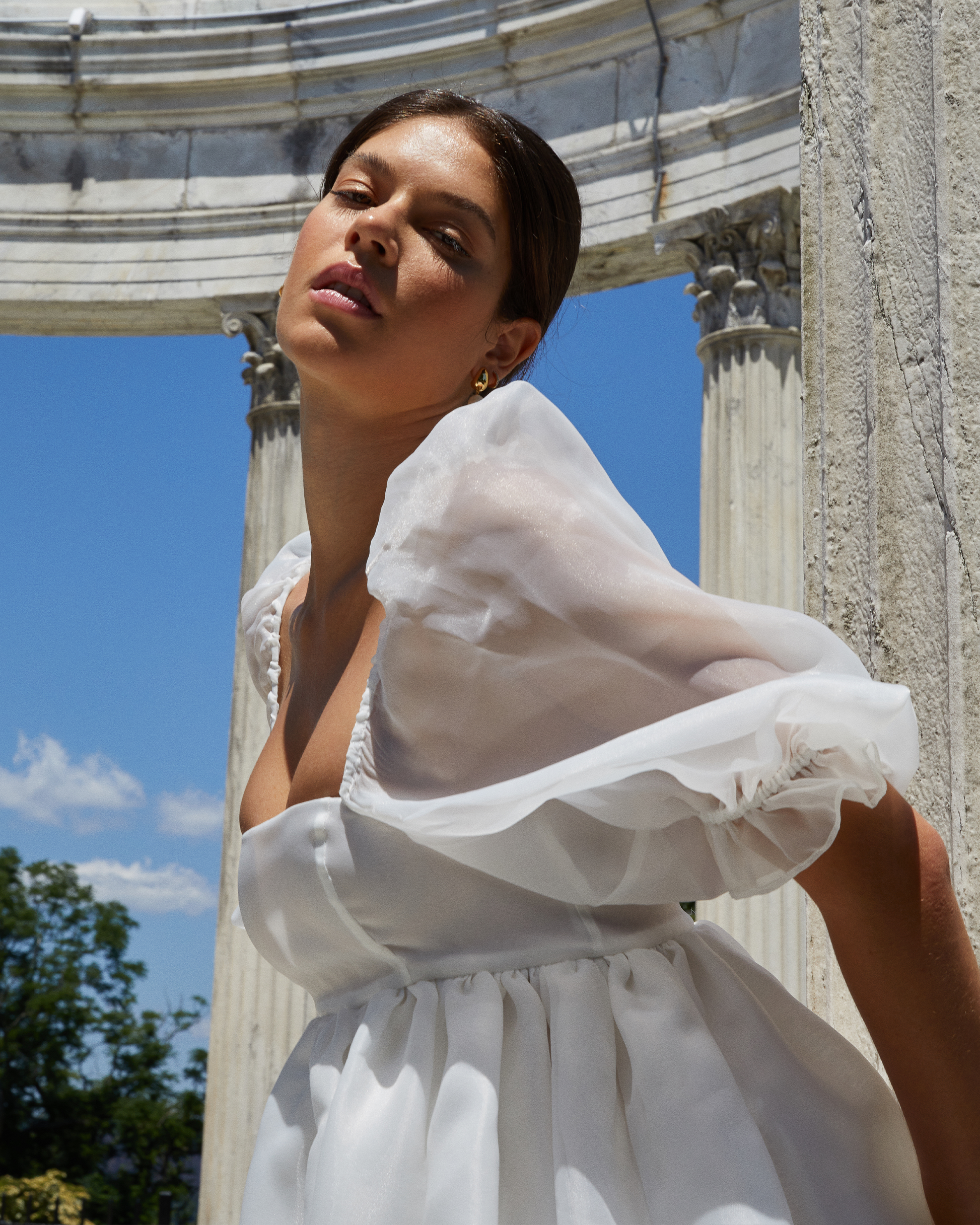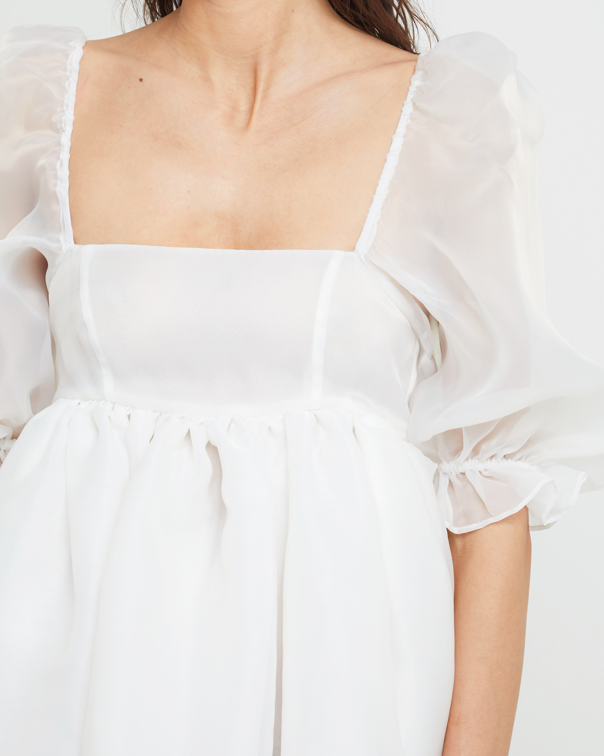 This beautiful midi dress features puff sleeves, square neckline, and slightly sheer bodice. The high waistline adds the finishing touch.
