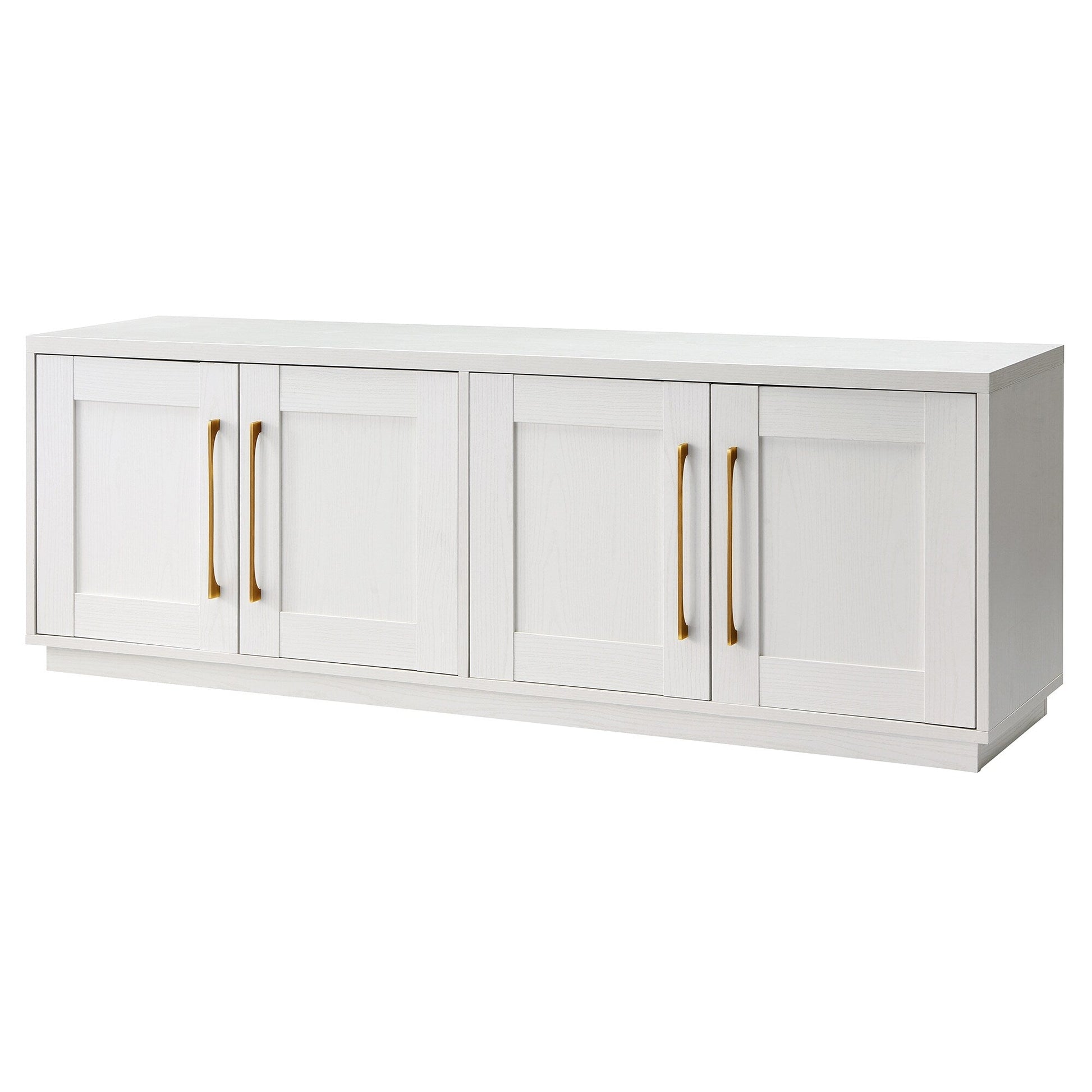 Combine functionality and classic transitional design with this modern TV stand. Its rich wood tone creates a warm neutral palette that will blend seamlessly into any color scheme, while its classic styling pairs perfectly with the existing design inspiration of your living room, den, or game room. This solid-backed stand features two large enclosed cabinets with sleek brass-finished hardware. Cable management cut-outs and adjustable inner shelves help keep your media storage and consoles organized.